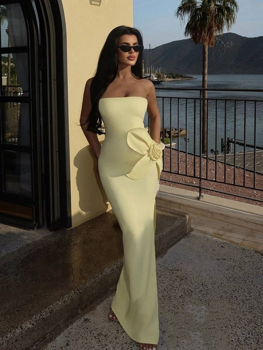 3D Floral Decor Bandeau Bodycon Elegant DressRegular price 25 JDPastel Yellow Pink Burgundy Violet Baby Blue + 3