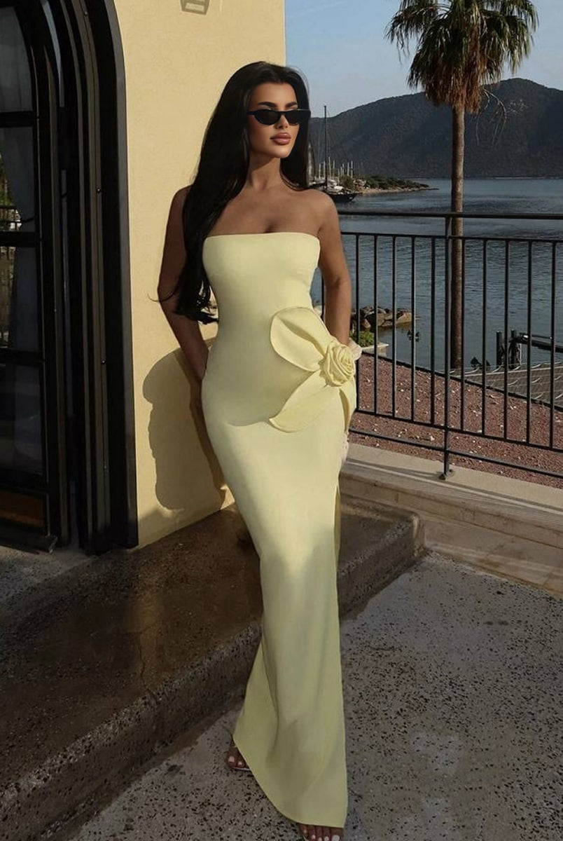 3D Floral Decor Bandeau Bodycon Elegant Dress25 JODPastel Yellow Pink Burgundy Violet Baby Blue + 3