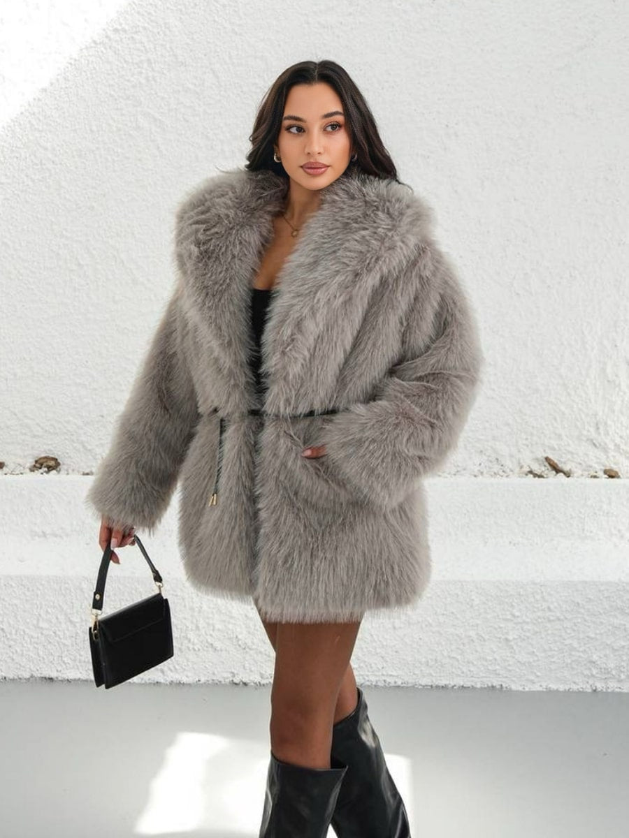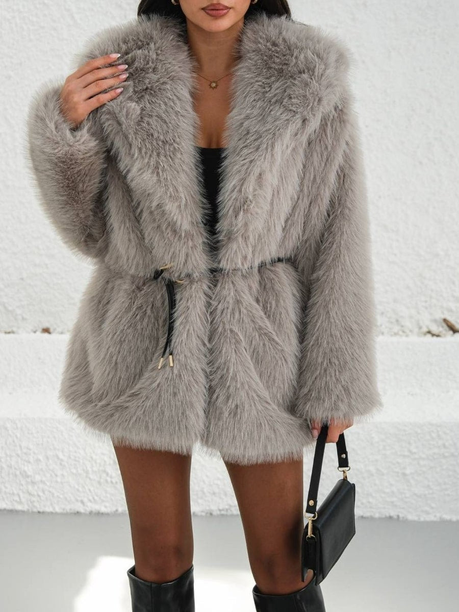 Faux Fur Turndown Collar Long Sleeve Belted Coat