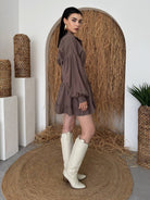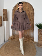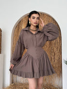 Long Sleeve Button-Up Shirt & Ruffle Hem Solid Color Skirt 2pcs Set