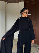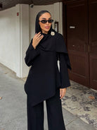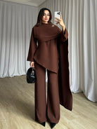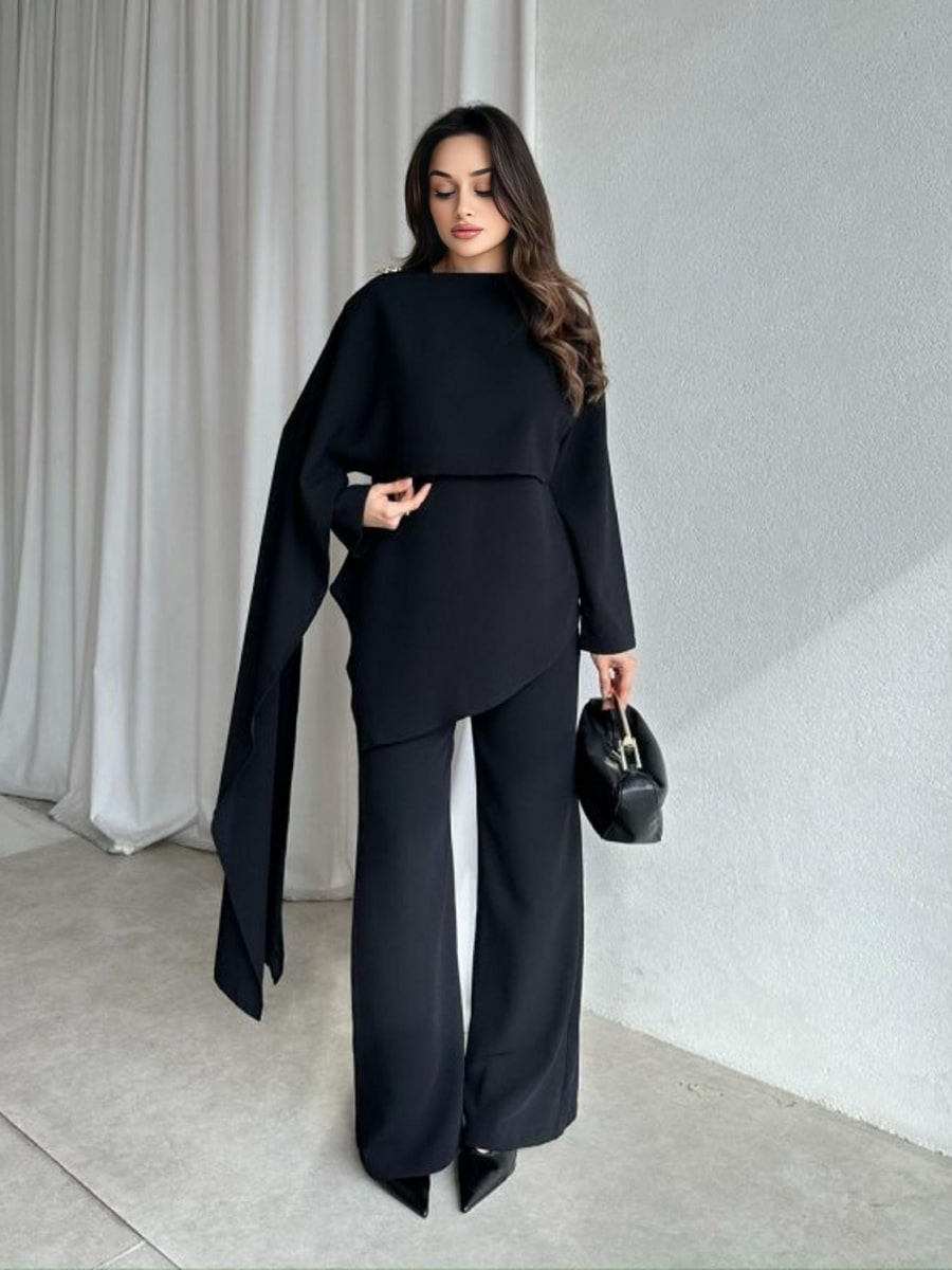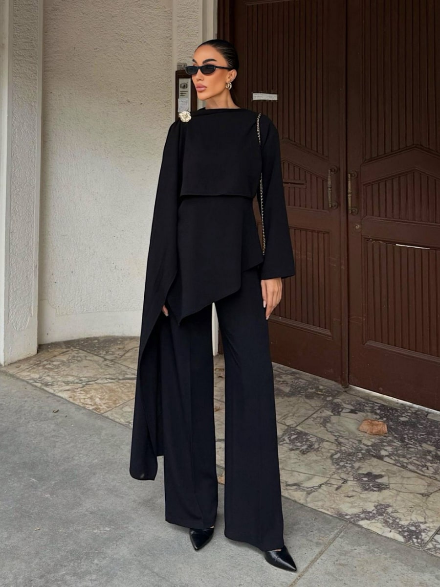 Solid Color Asymmetric Blouse With Broch & Pants Set
