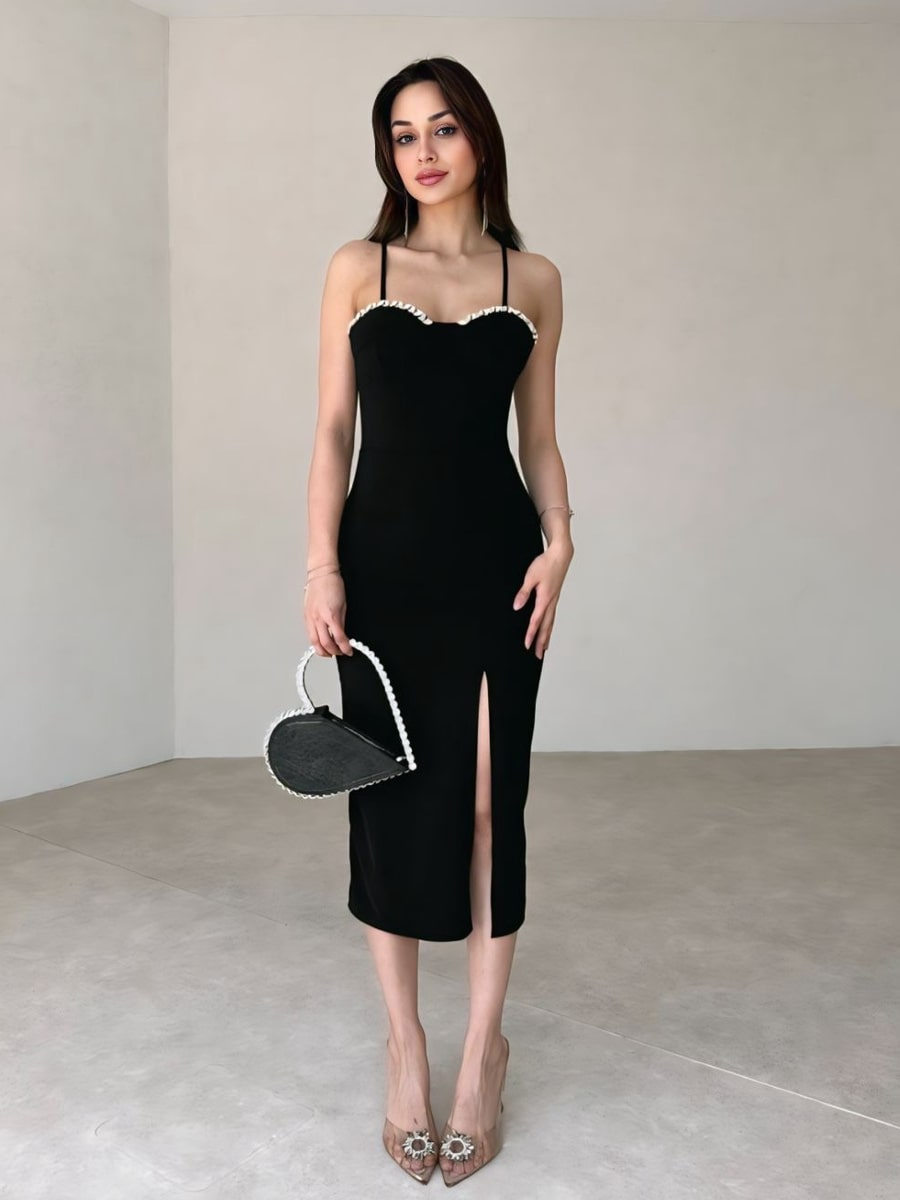 فستان ضيق بحمالات وسلسلة من أحجار الراين