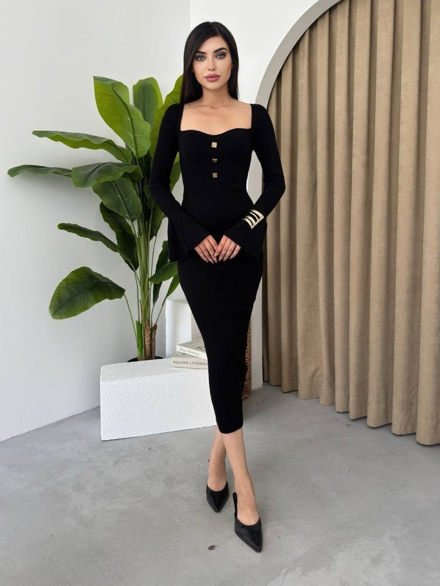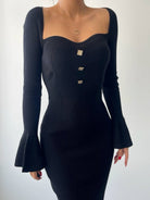 Sweetheart Neck Long Sleeve Metal Decor Fitted Elegant Knit Dress