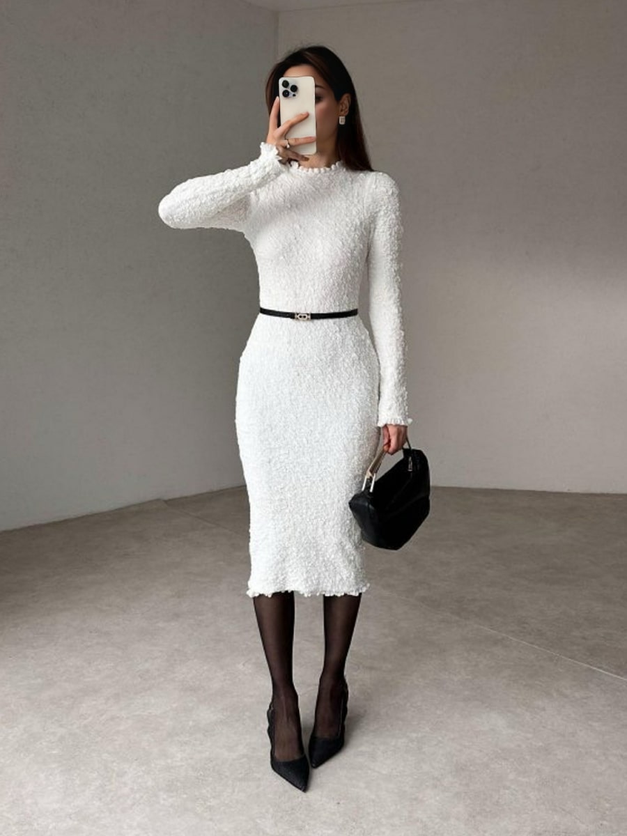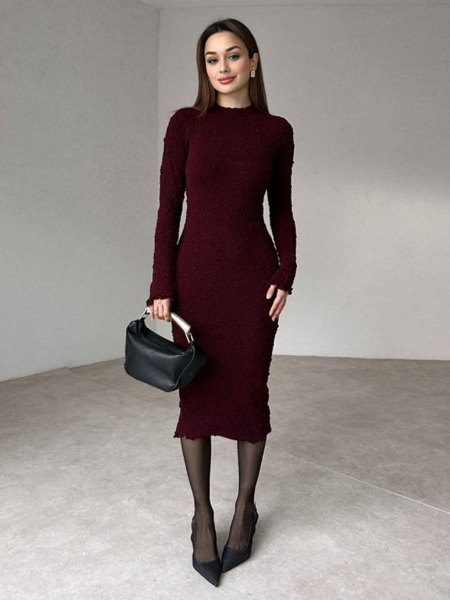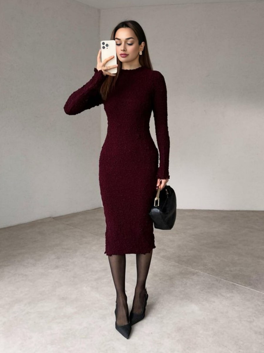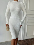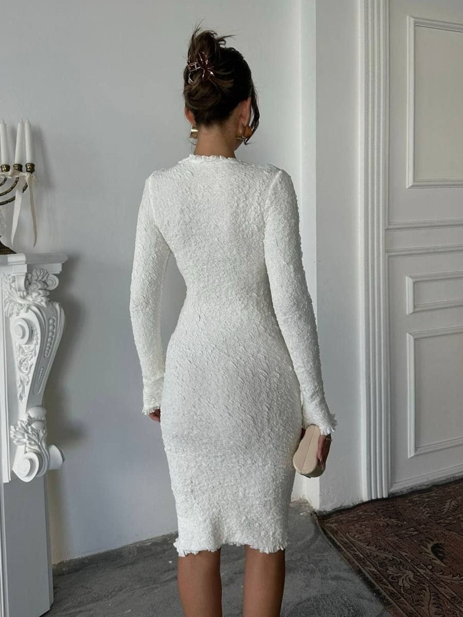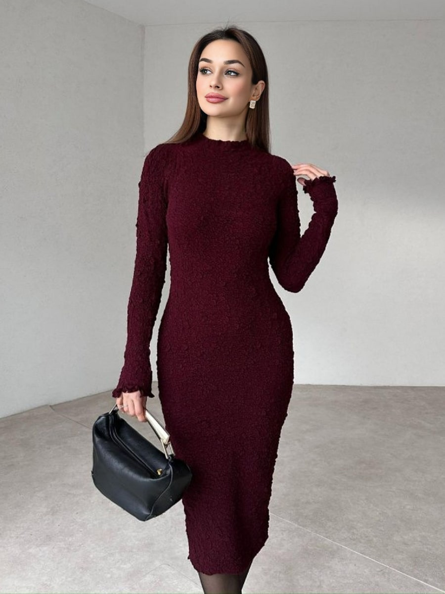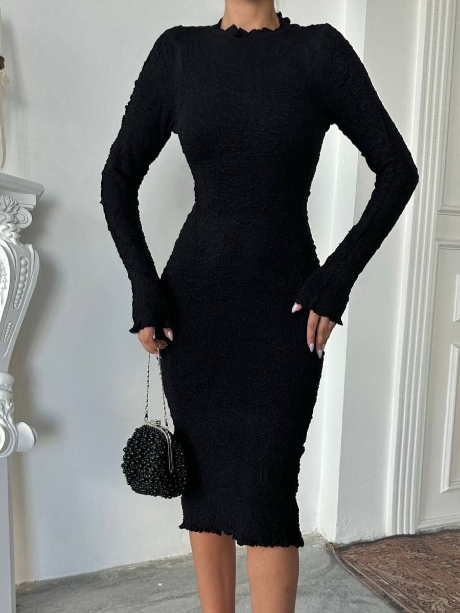 Solid Color Textured Long Sleeve Dress