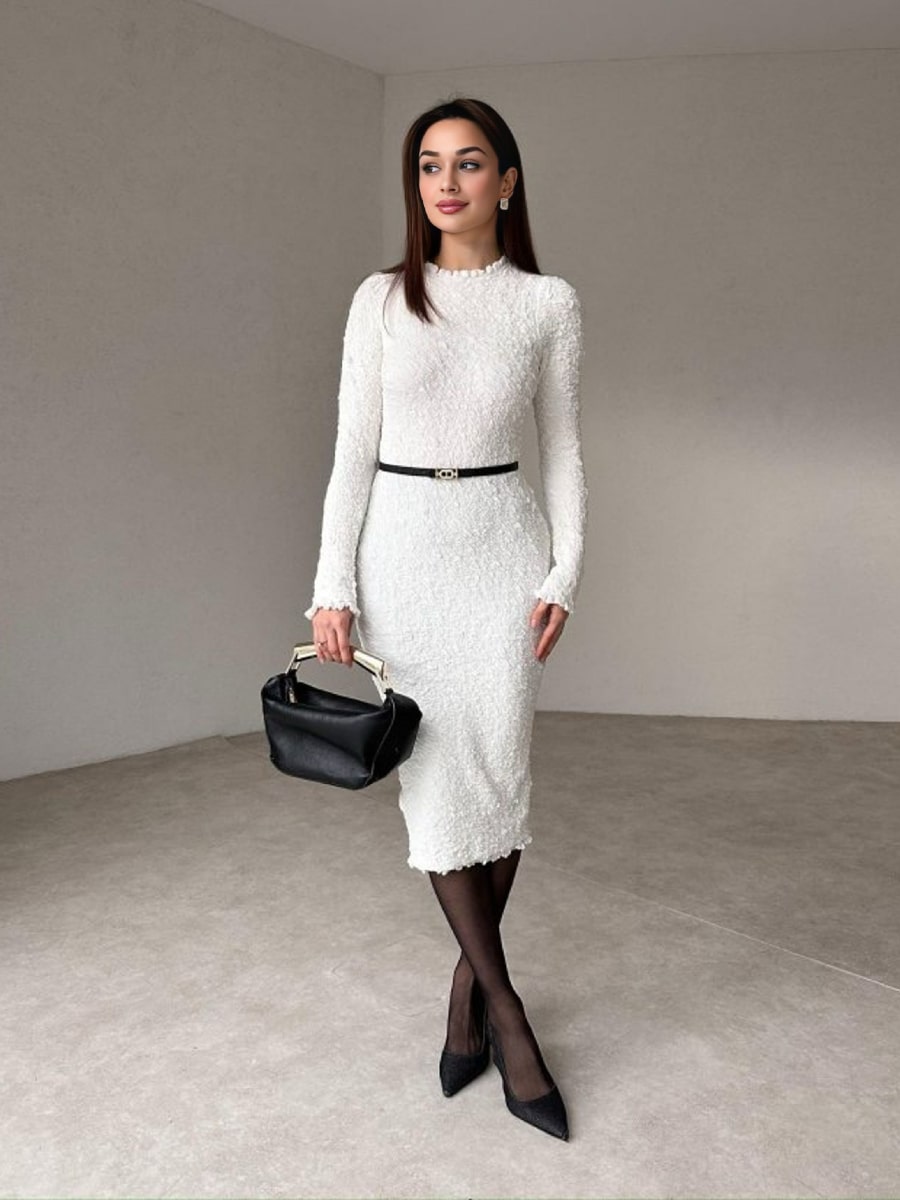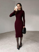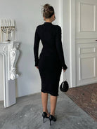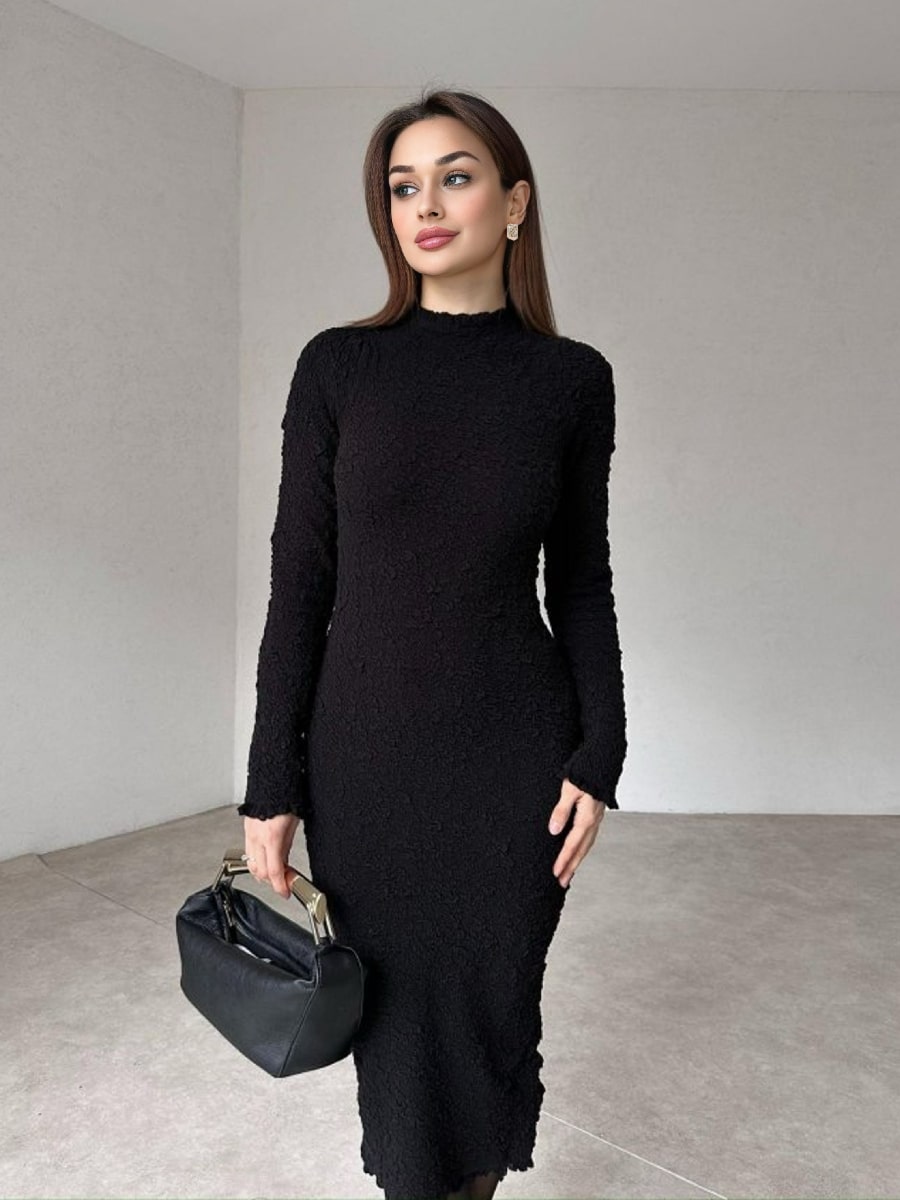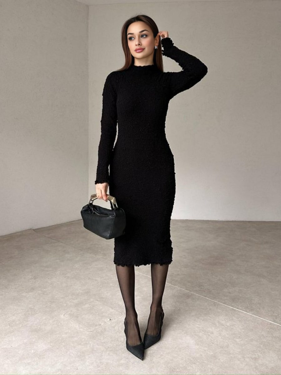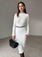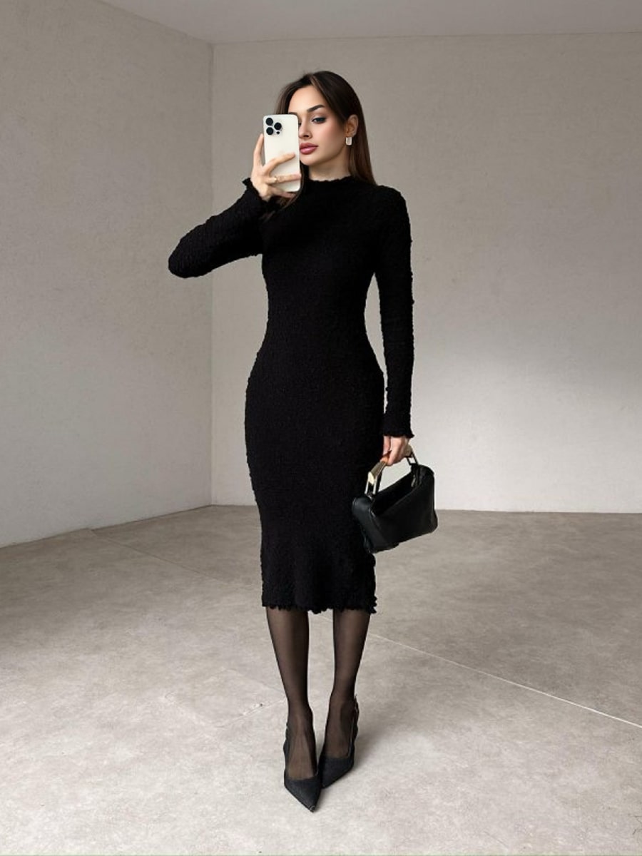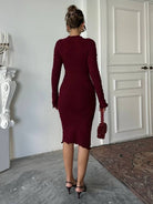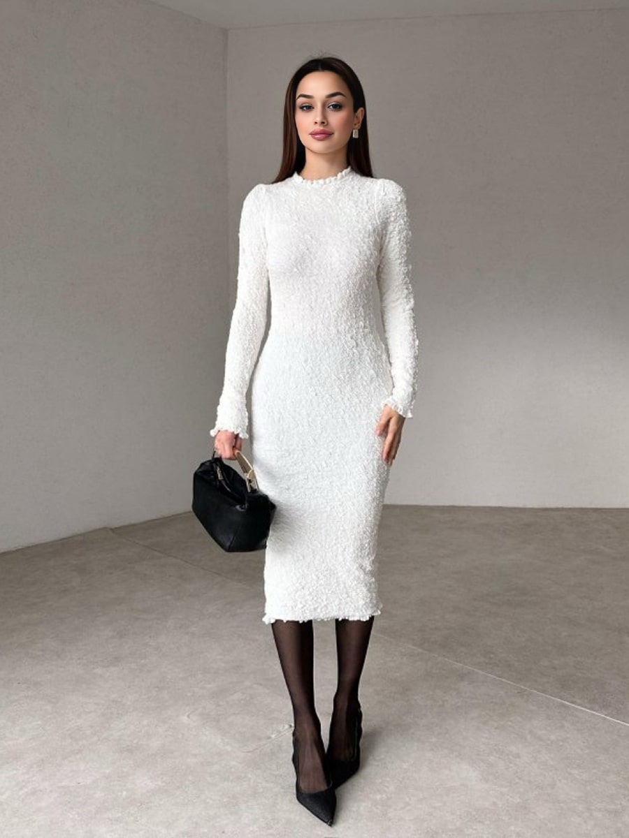Solid Color Textured Long Sleeve Dress