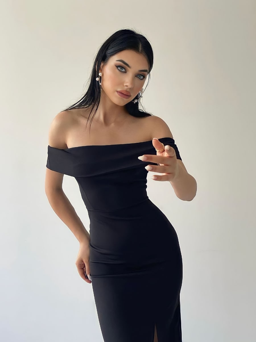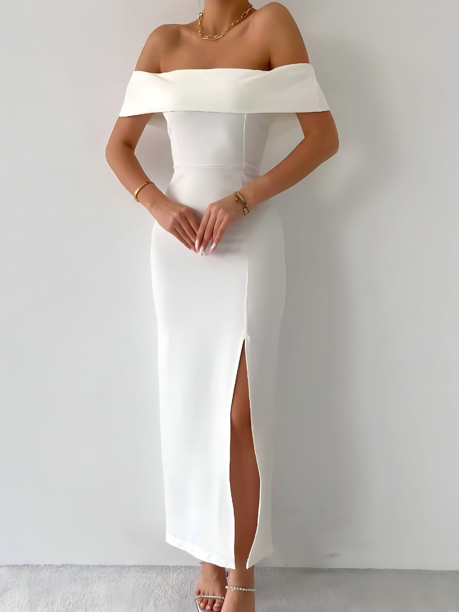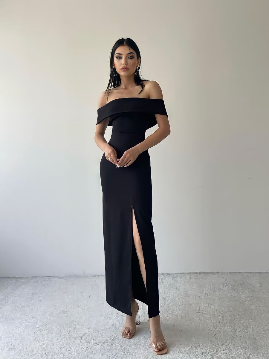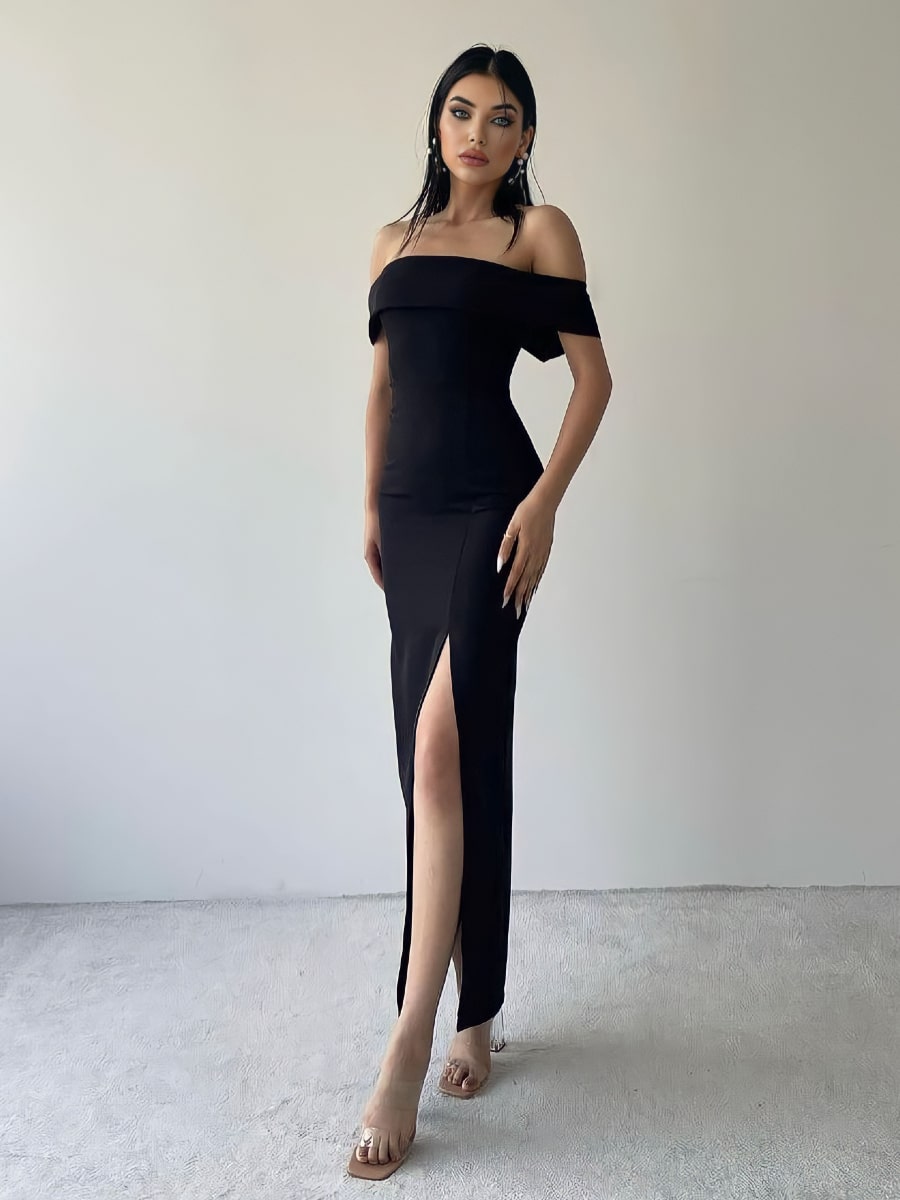فستان سادة مكشوف الكتفين وظهر مفتوح عند الفخذ