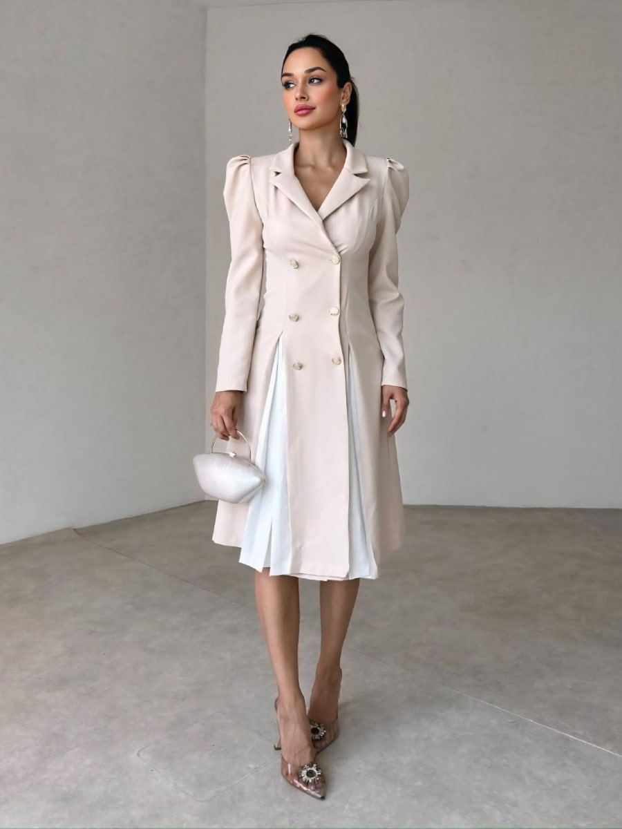 فستان مكتب أنيق بأكمام منفوخة وياقة مطوية وأزرار مزدوجة