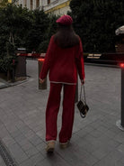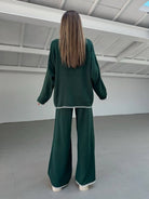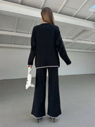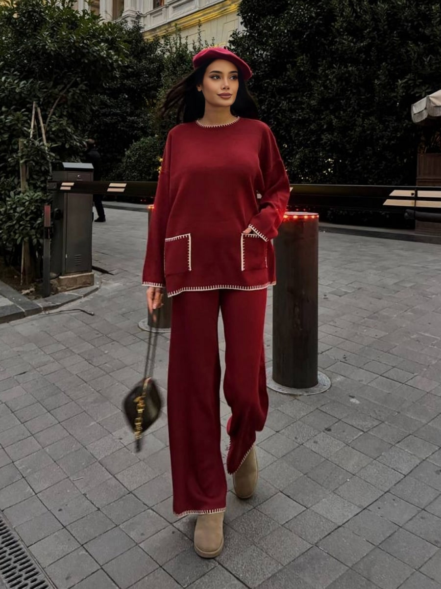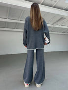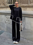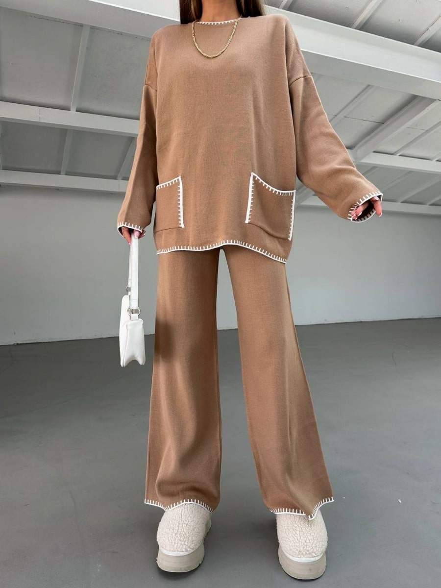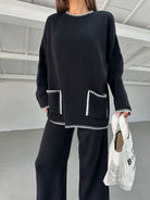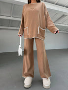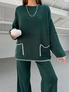 2pcs Color Block Sweater Long Sleeve Crew Neck With Dual Pockets Top & Pants Set