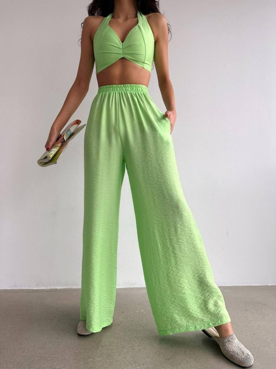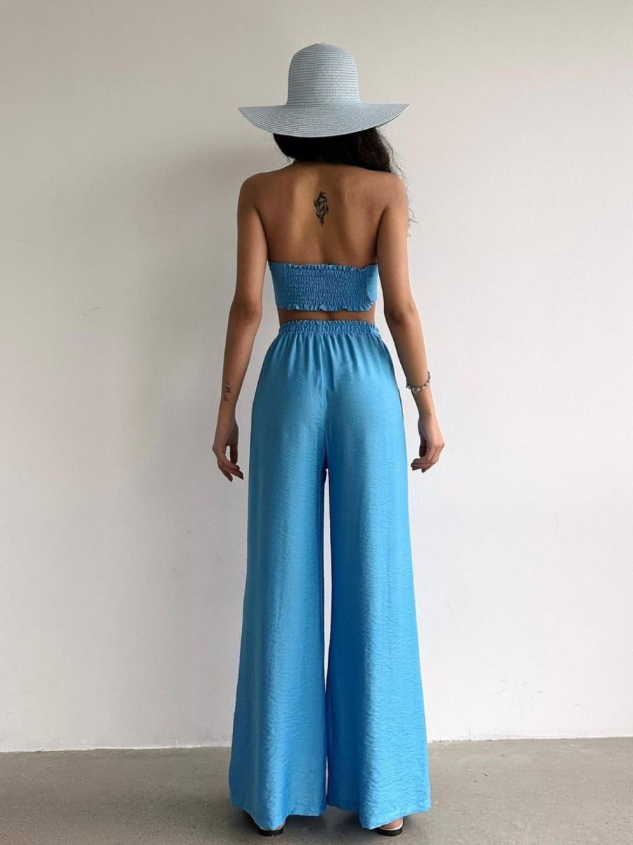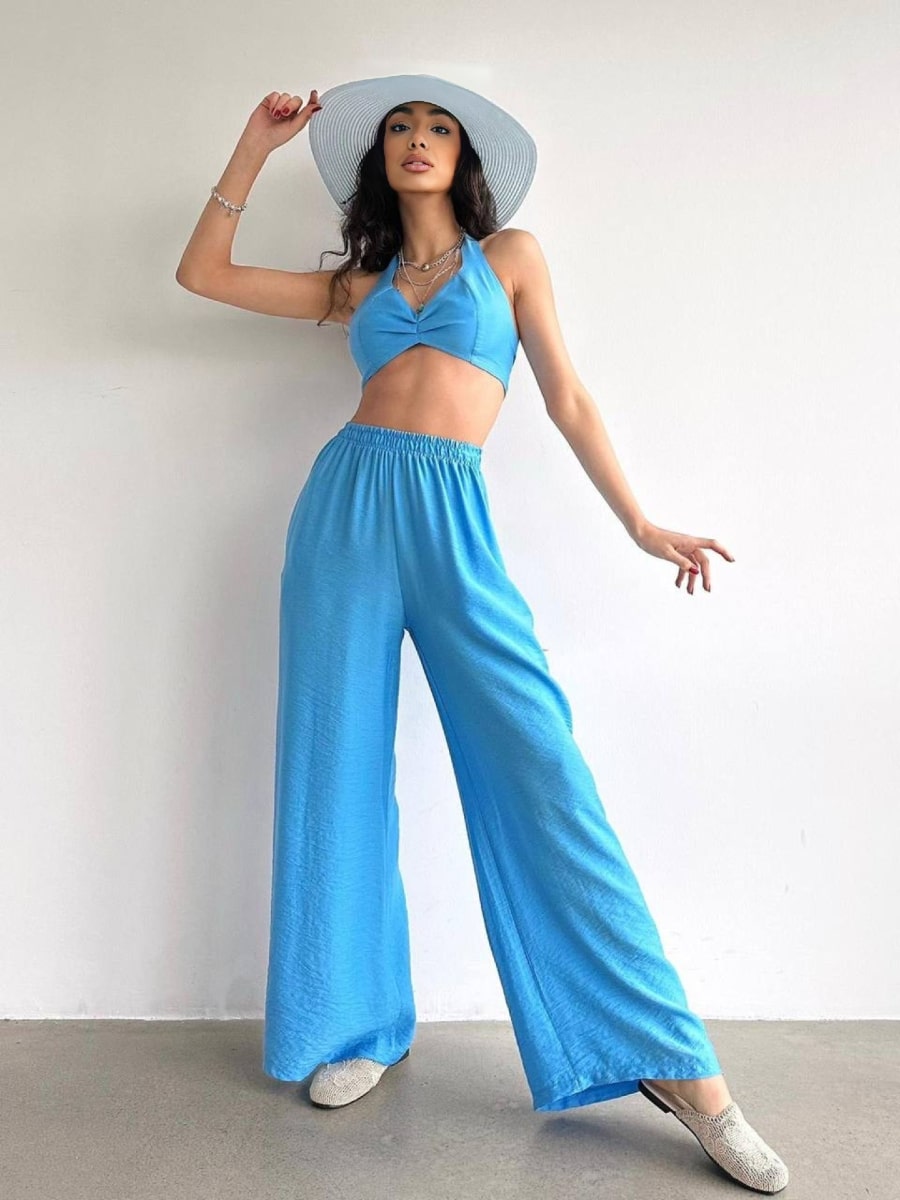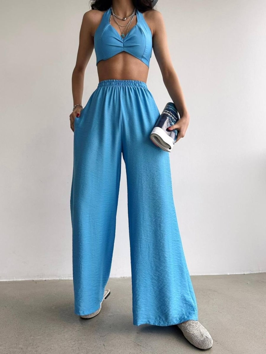 بلوزة قصيرة مكشوفة الظهر وبنطلون واسع الساق