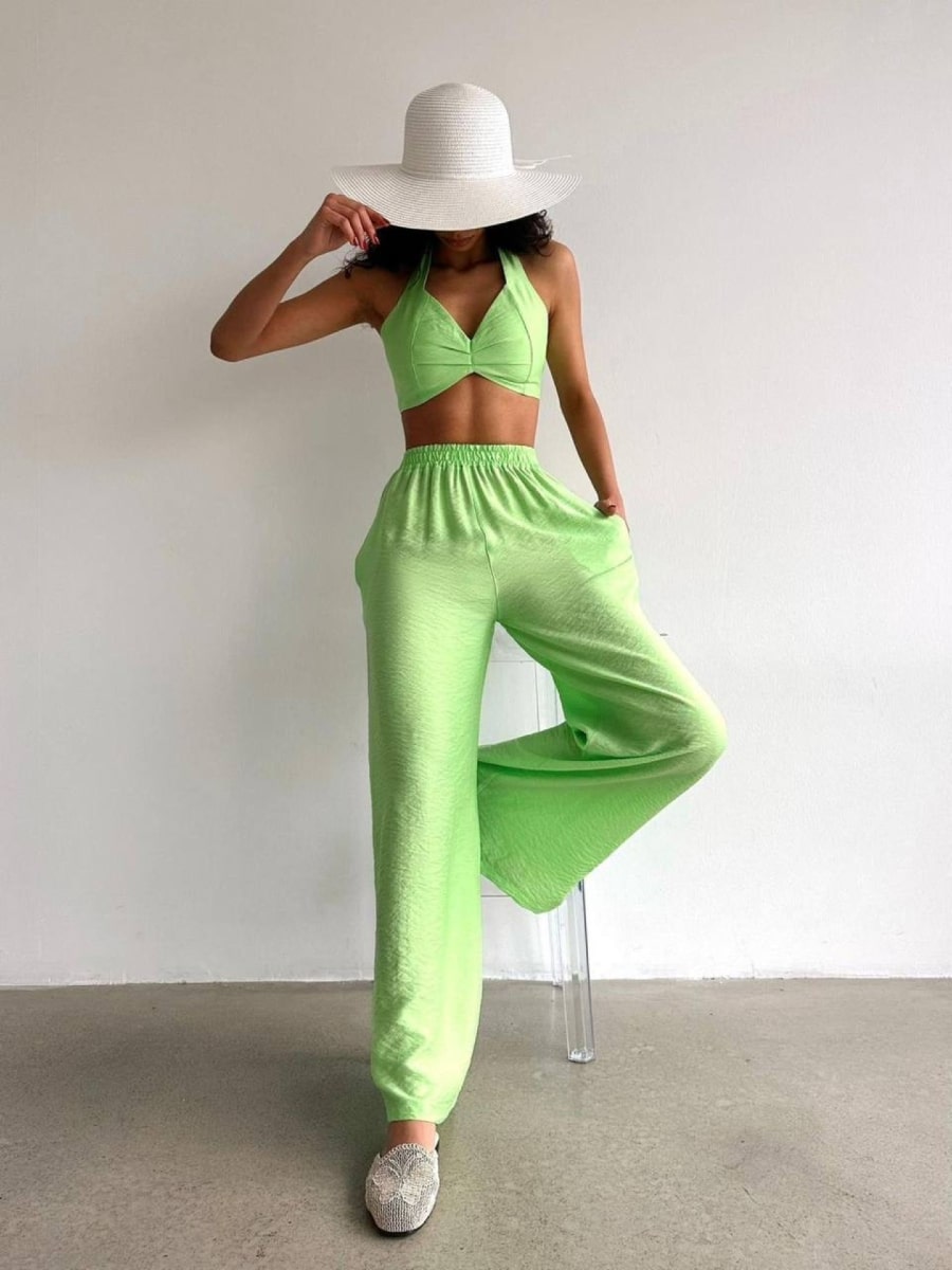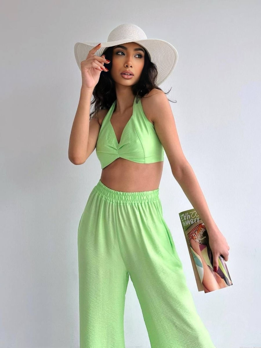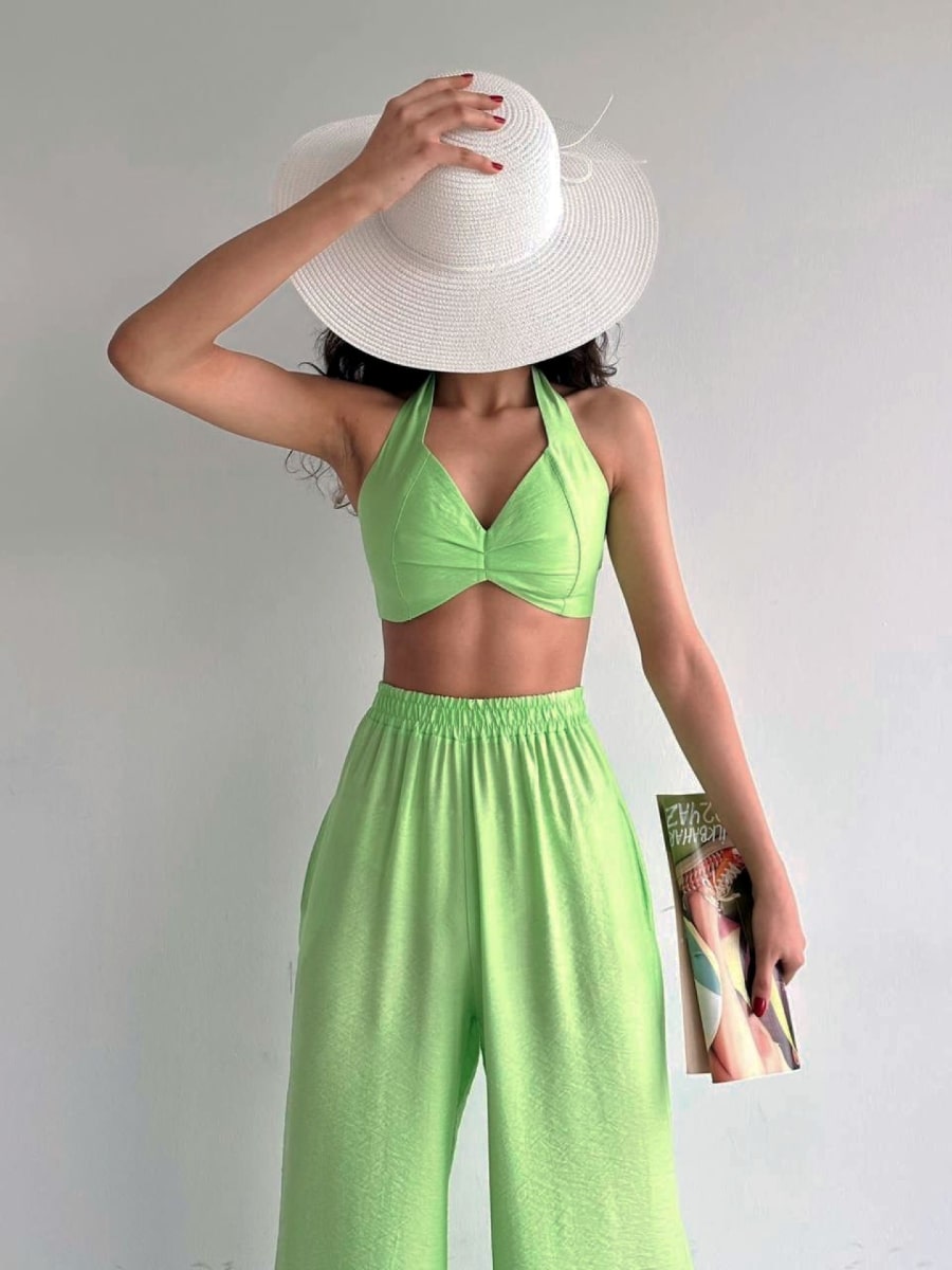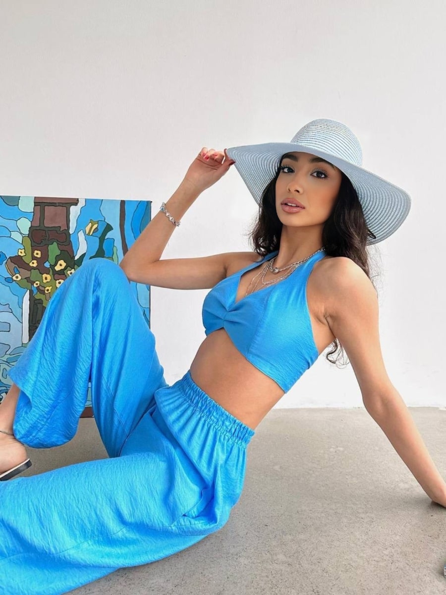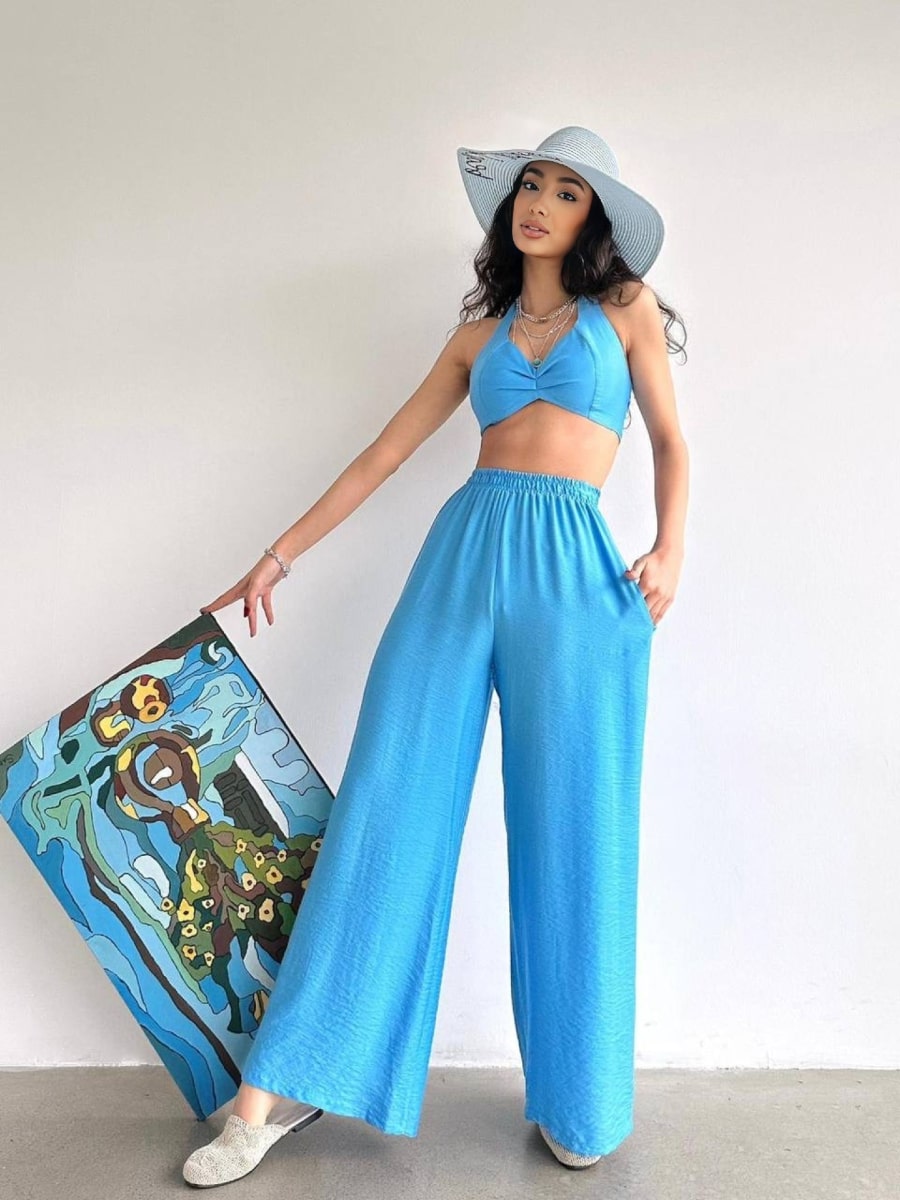بلوزة قصيرة مكشوفة الظهر وبنطلون واسع الساق