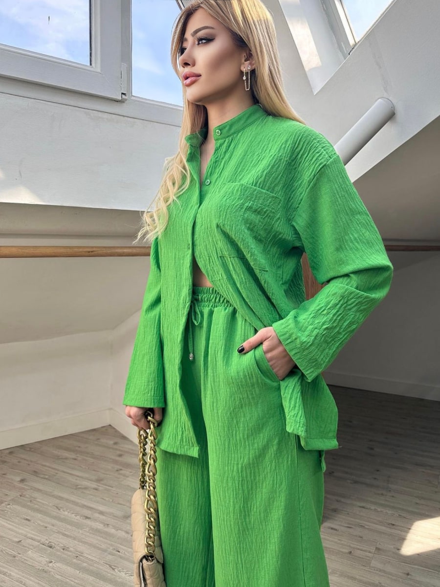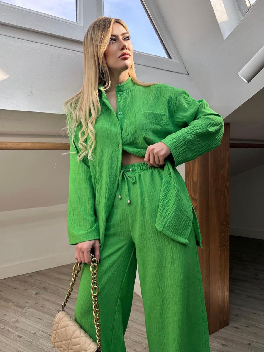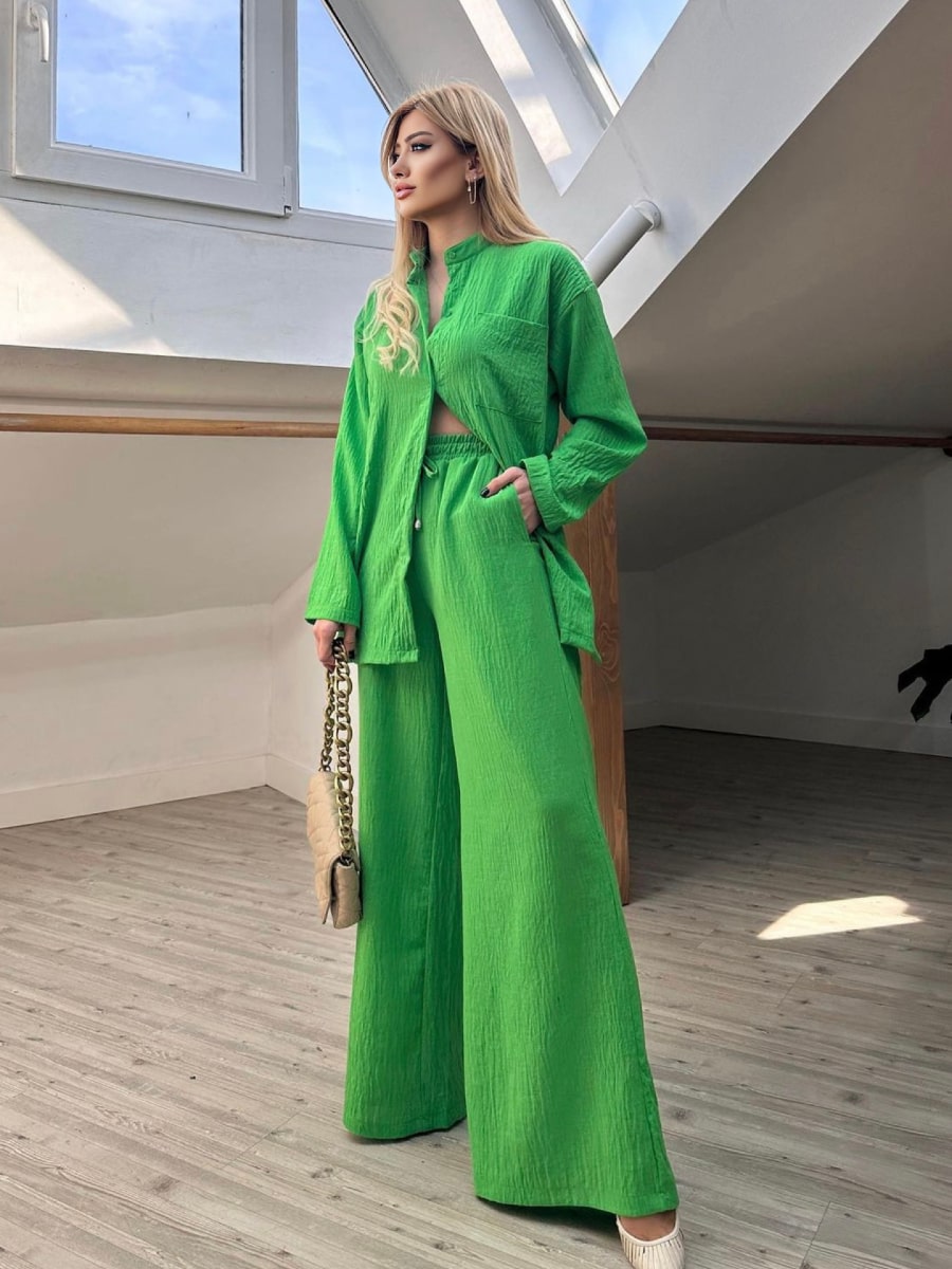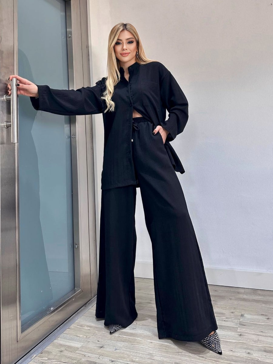 قميص ذو أكتاف منسدلة وبنطلون واسع الساق