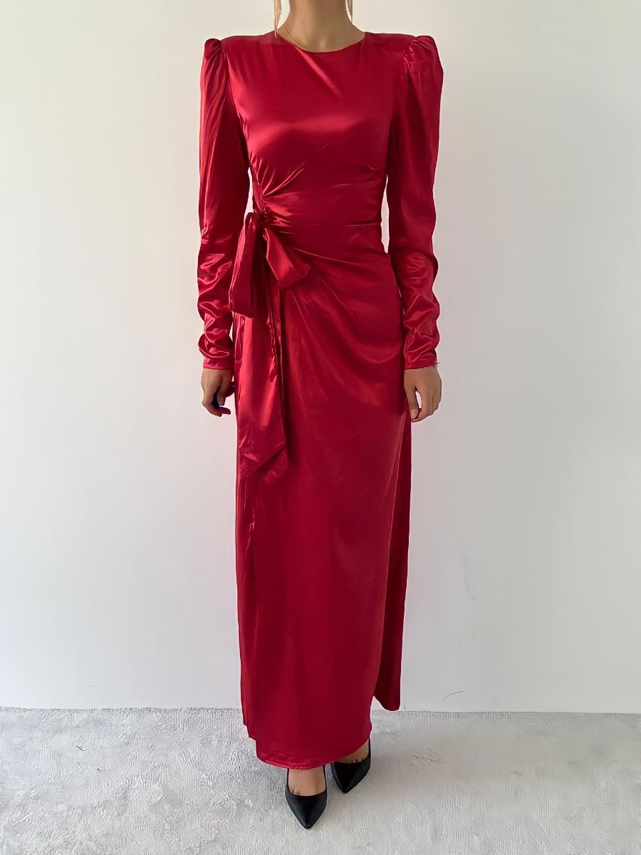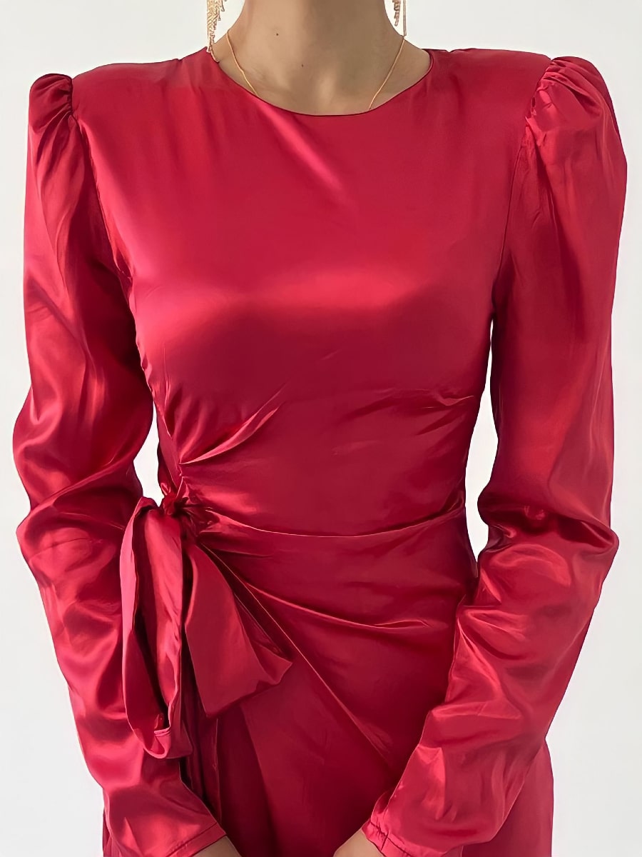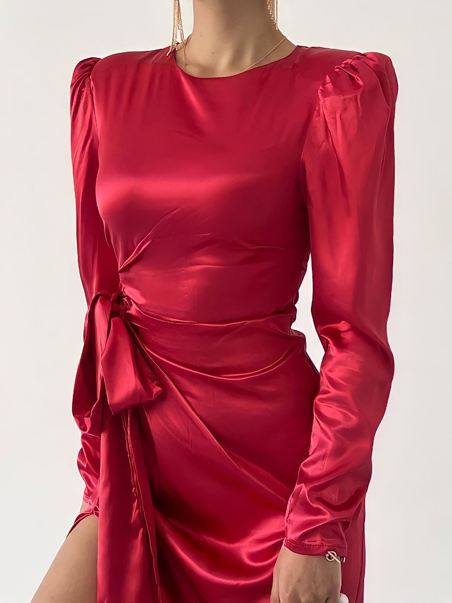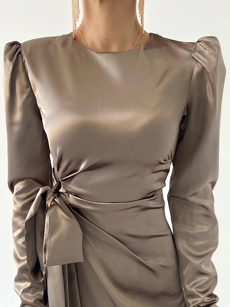 فستان ساتان بأكمام منفوخة وعقدة جانبية