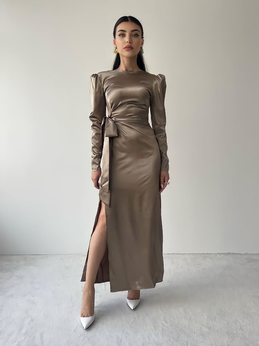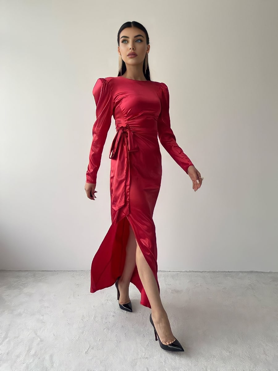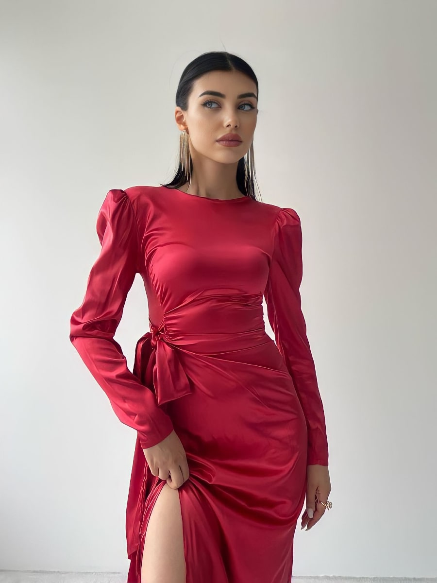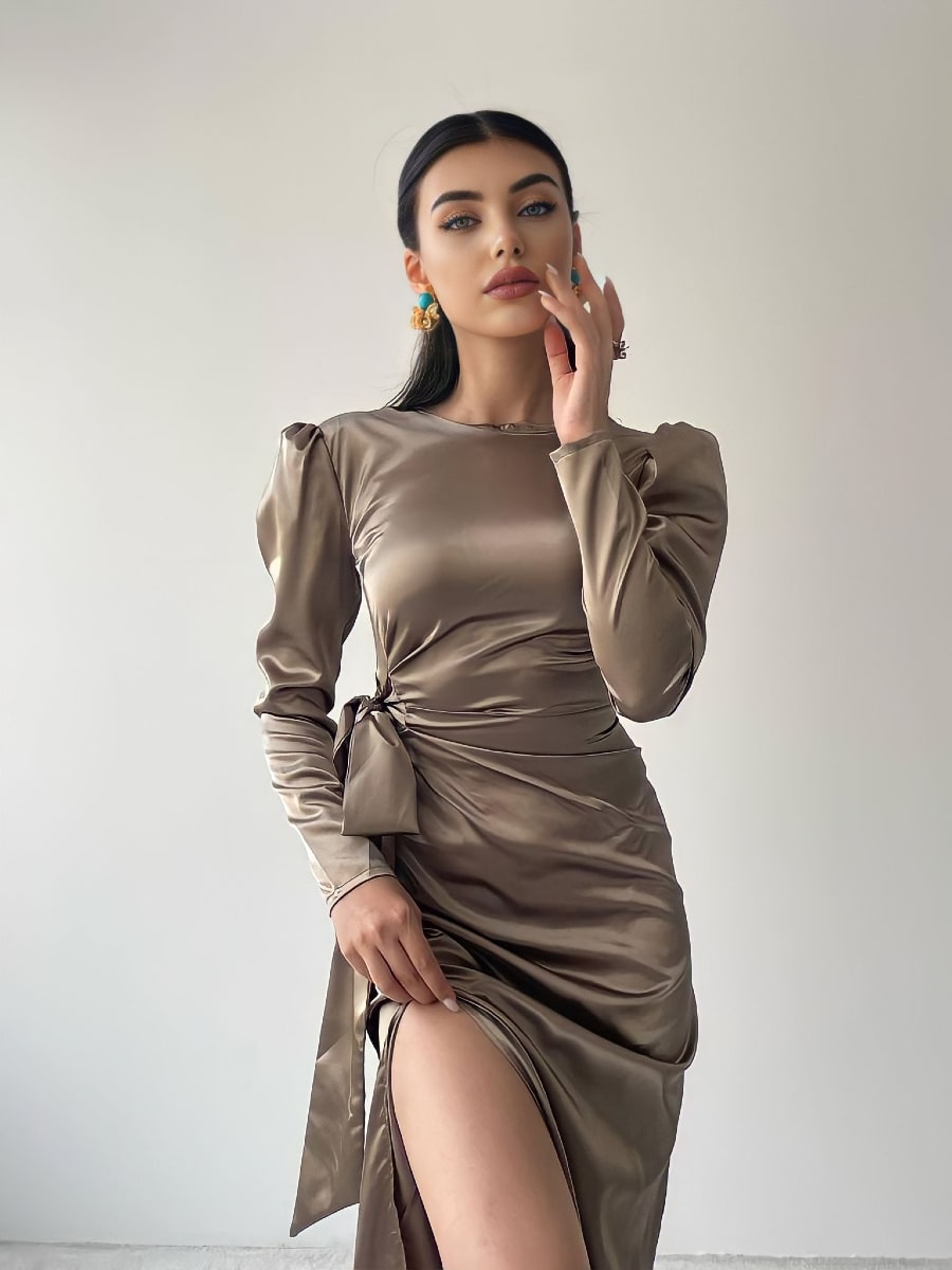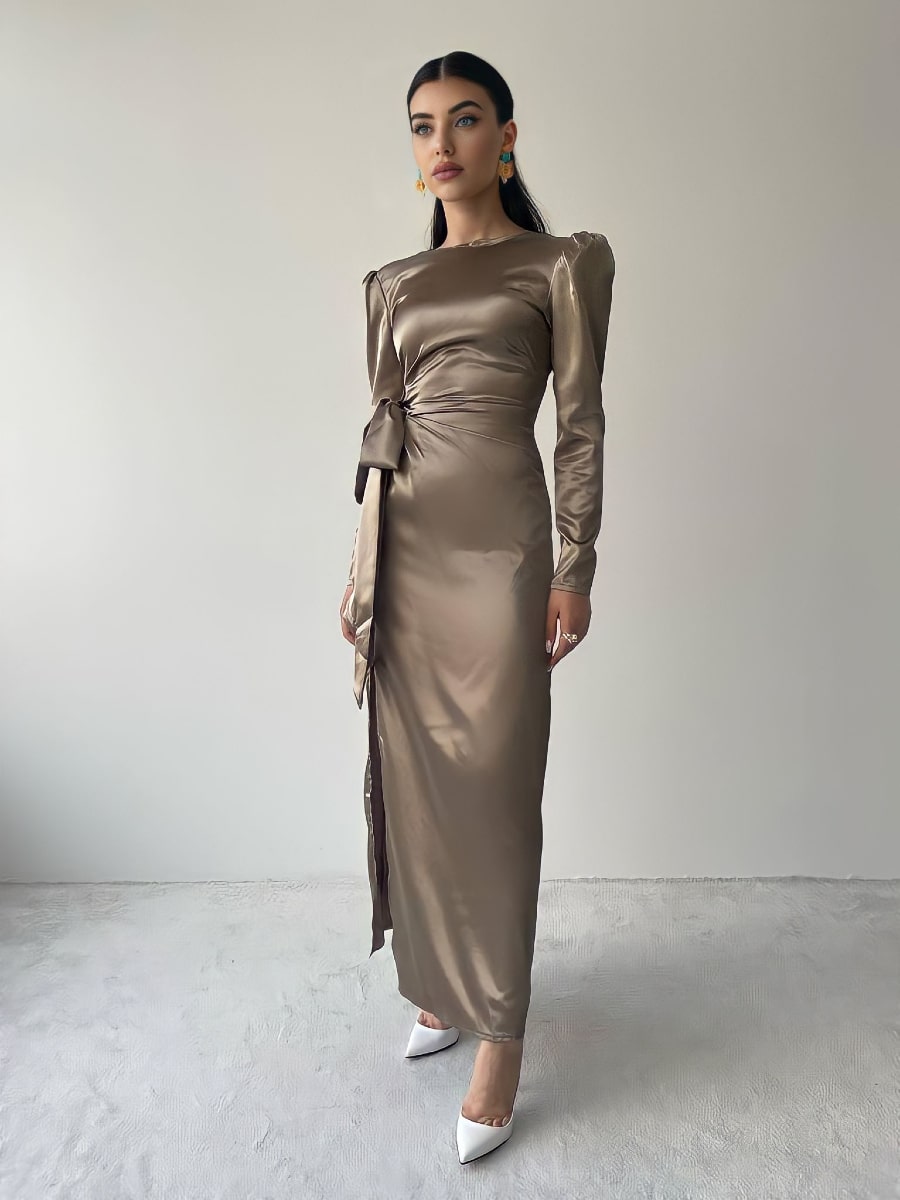 فستان ساتان بأكمام منفوخة وعقدة جانبية