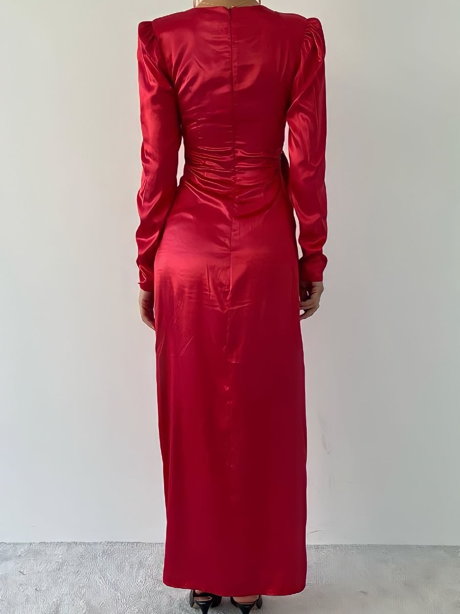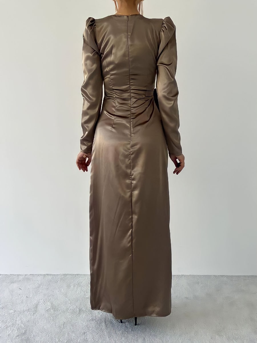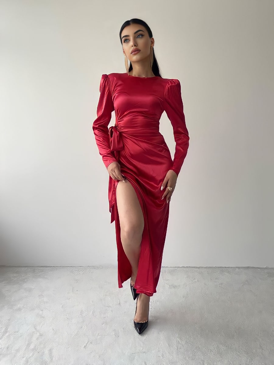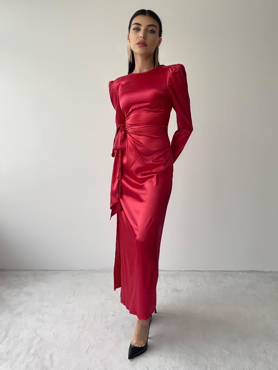 فستان ساتان بأكمام منفوخة وعقدة جانبية