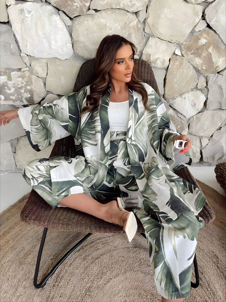 كيمونو مفتوح من الأمام وبنطلون بطبعة استوائية