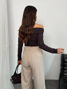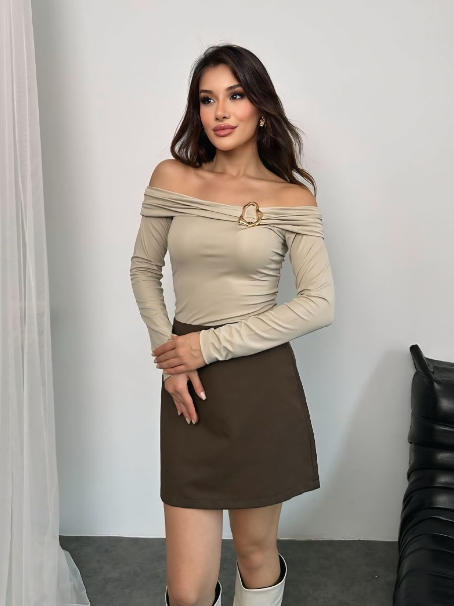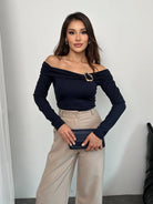 Off-Shoulder Metal Decor Long Sleeve Fitted Top