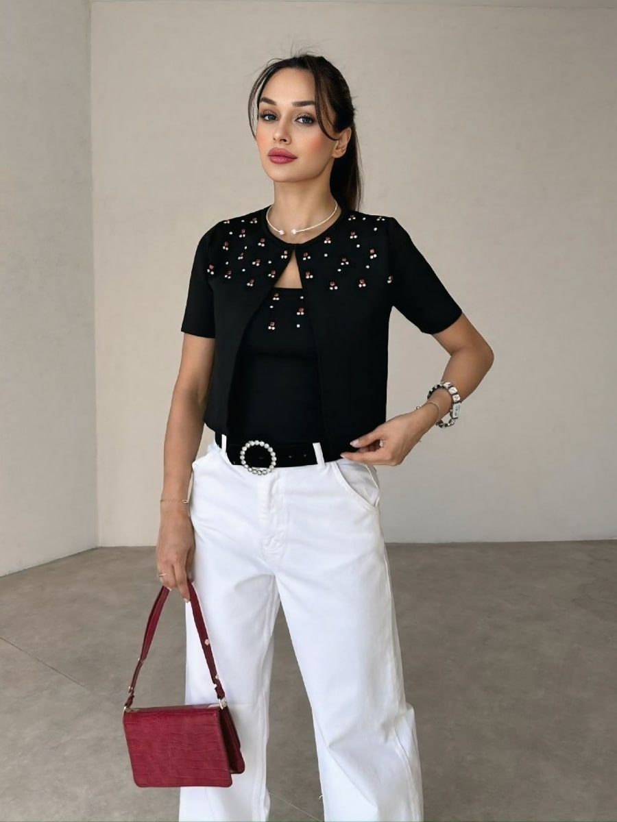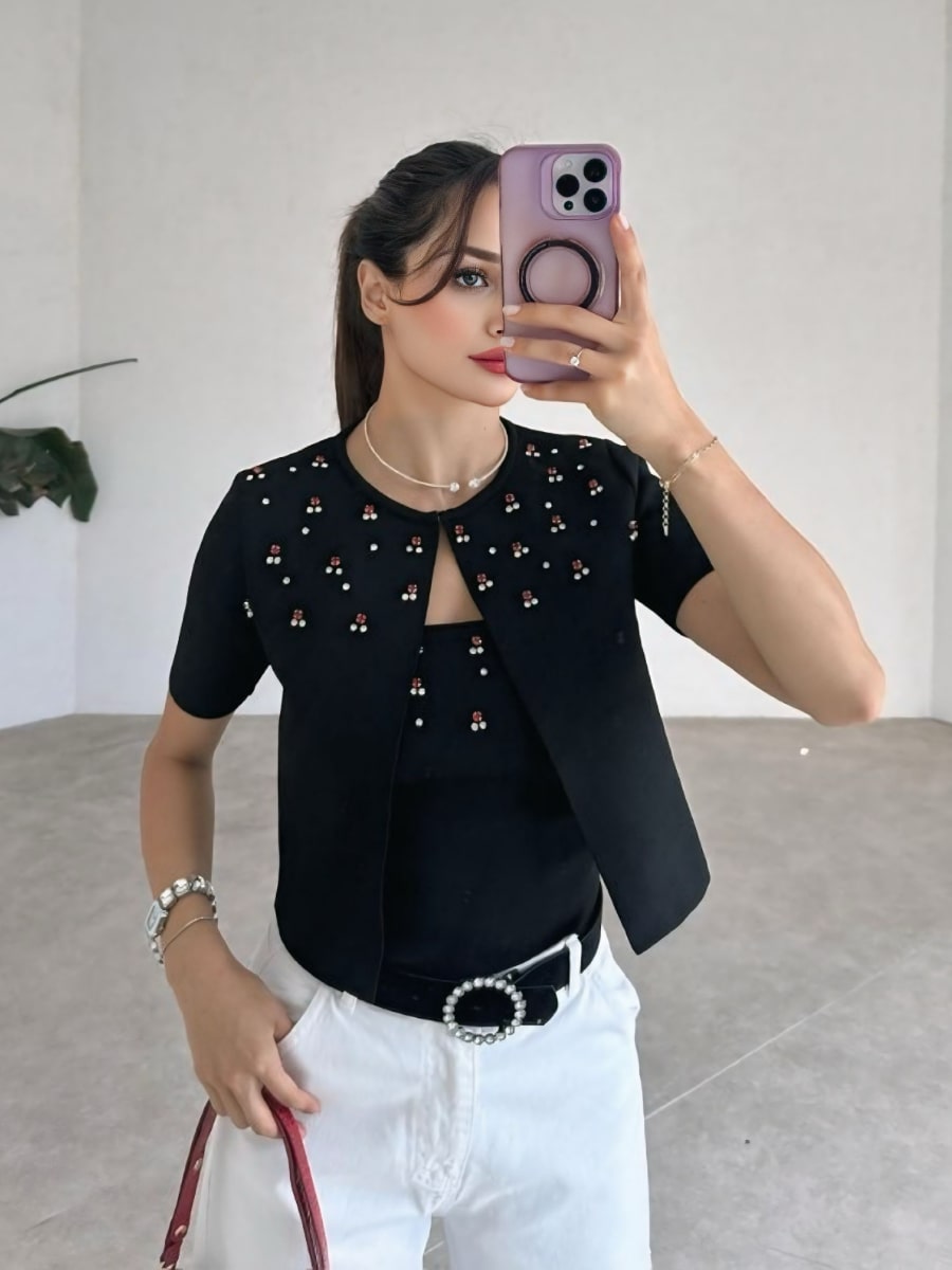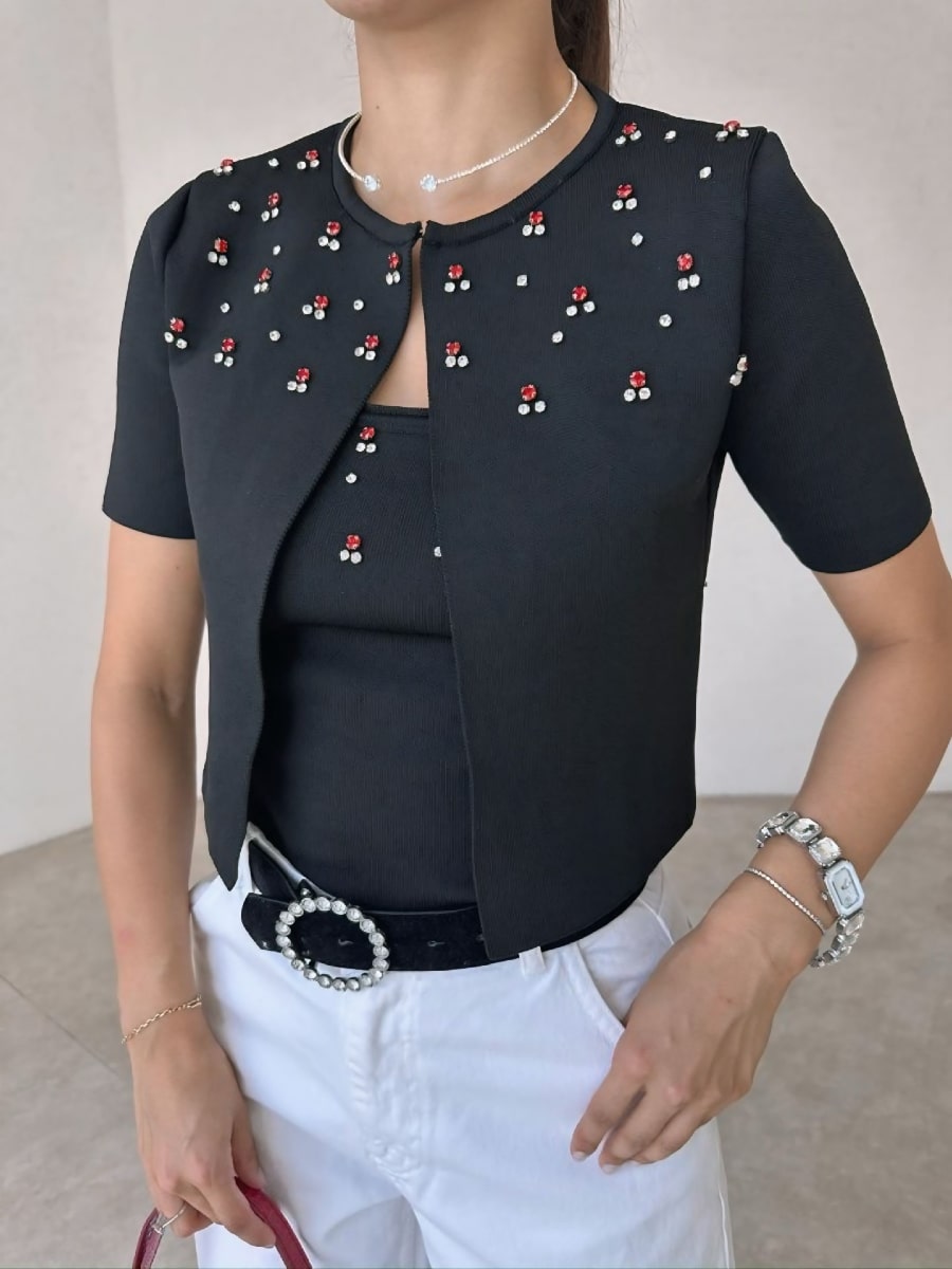 كارديجان محبوك مزين بأحجار الراين وقميص علوي