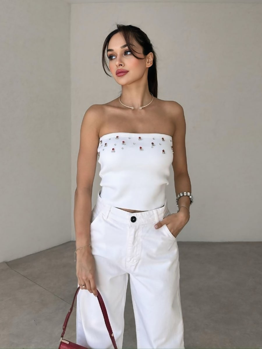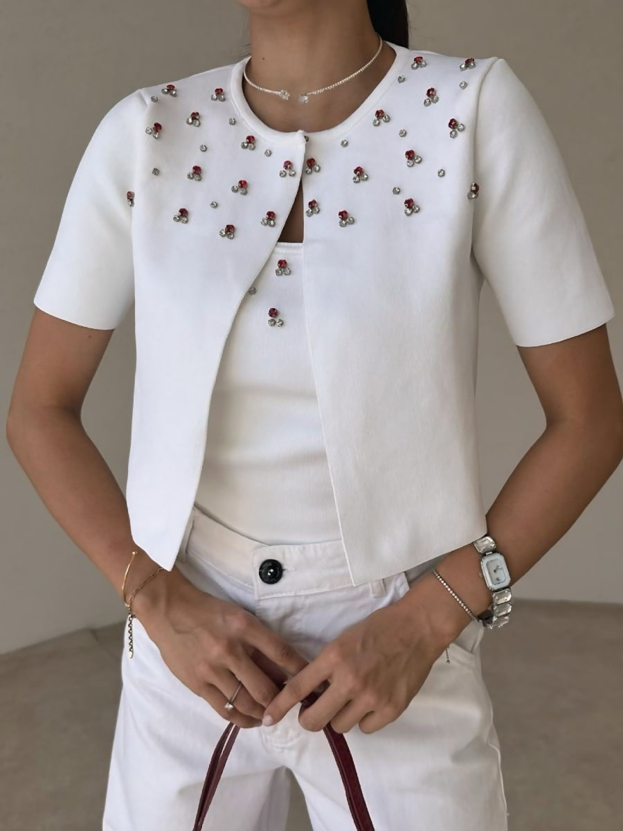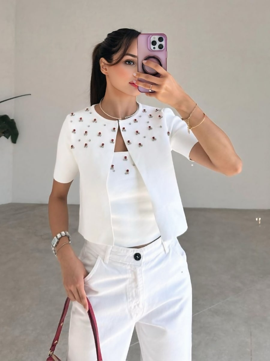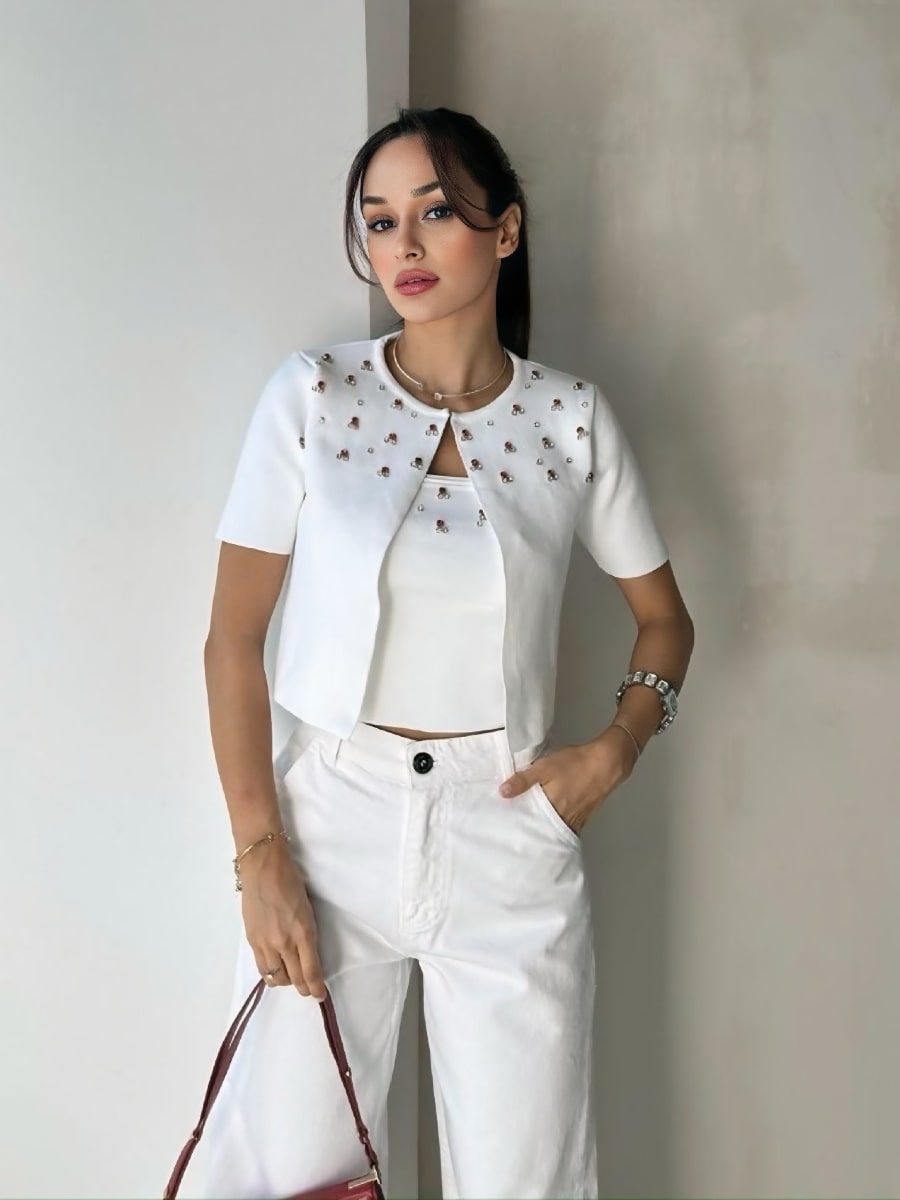 كارديجان محبوك مزين بأحجار الراين وقميص علوي