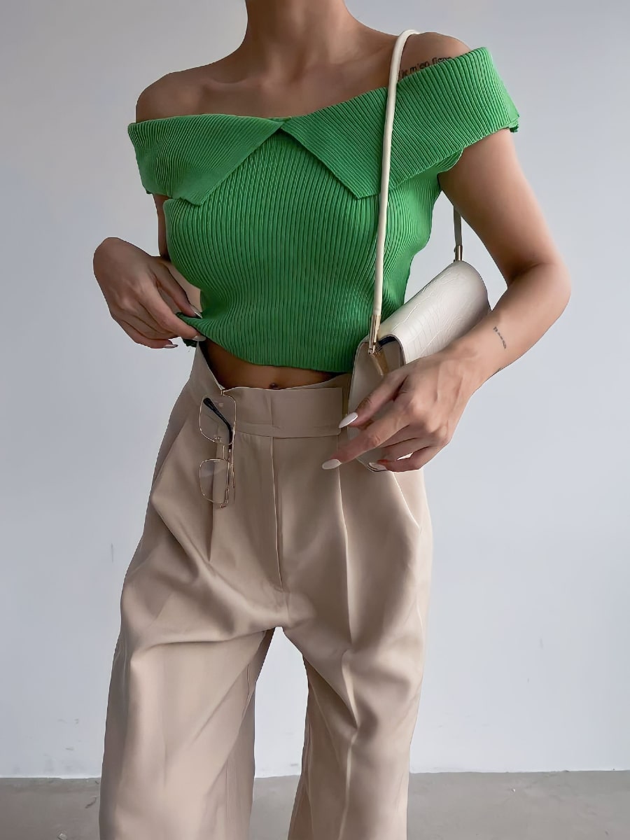 بلوزة محبوكة مضلعة مكشوفة الكتفين قابلة للطي