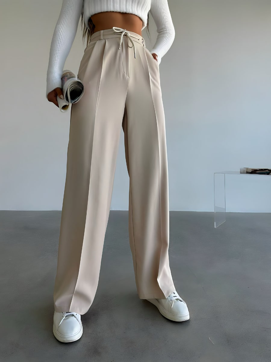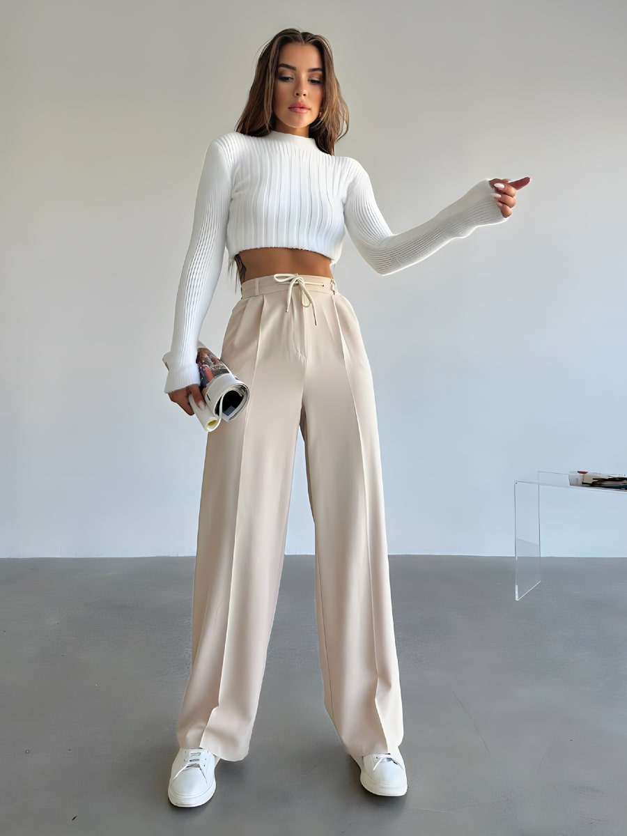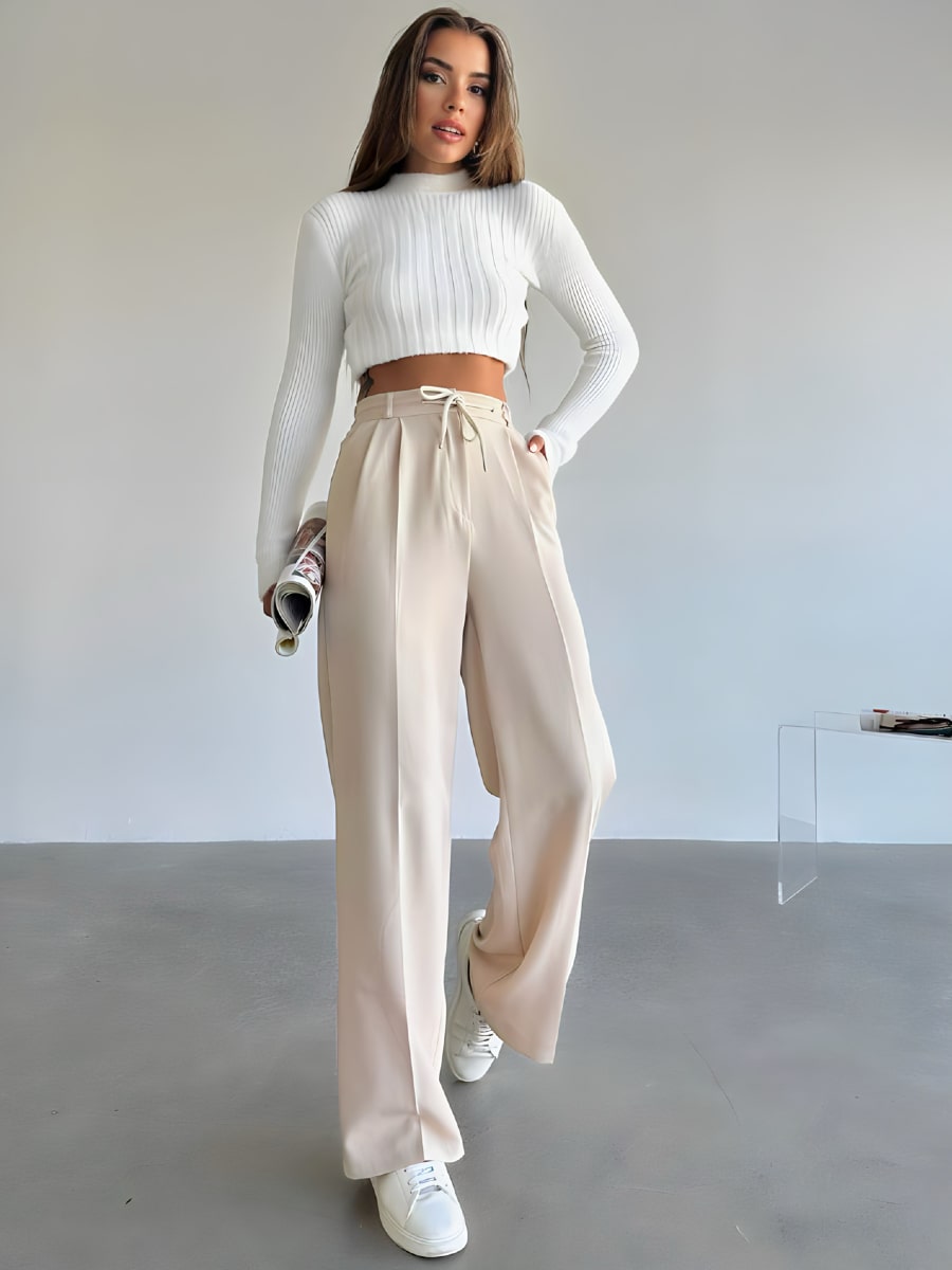 بنطلون بدلة واسع الساق بعقدة أمامية وخصر مرتفع