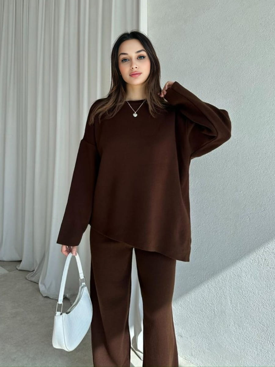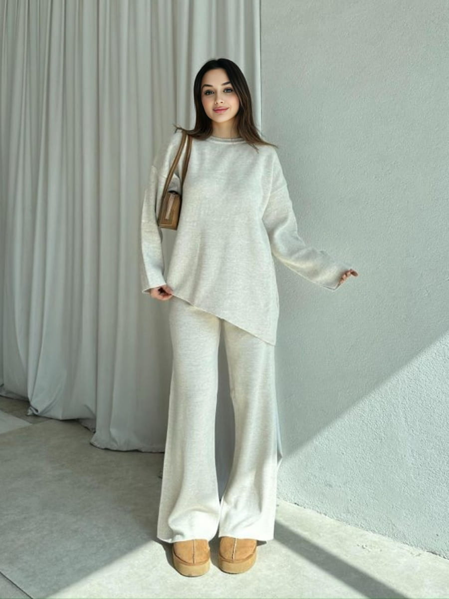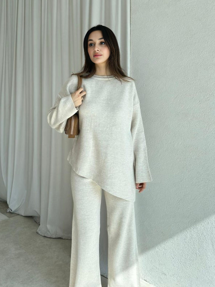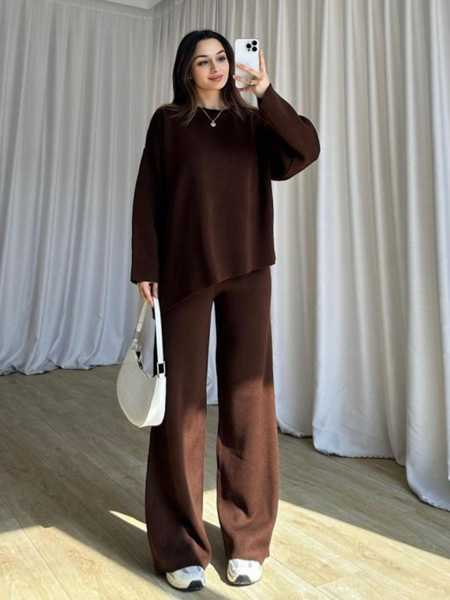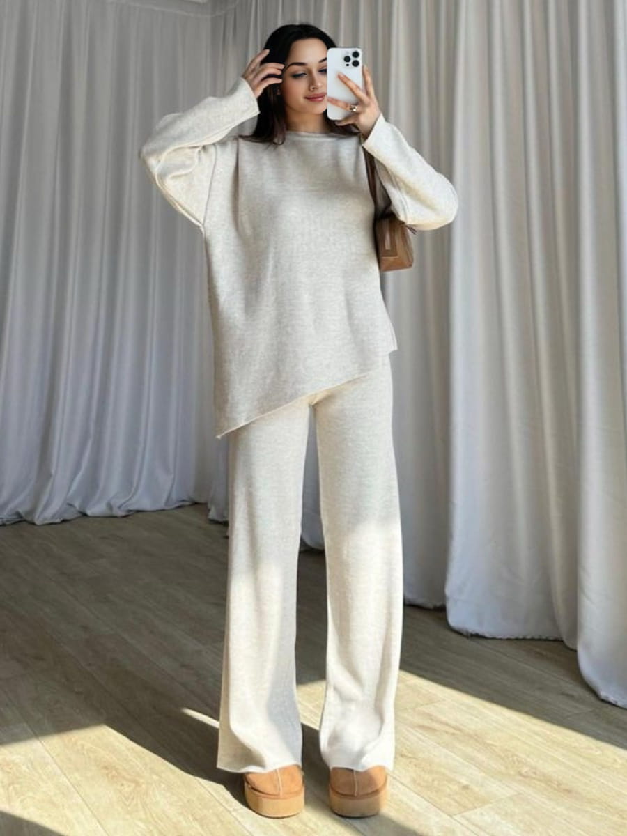 Round Neck Solid Color Asymmetrical Hem Sweater & Knitted Pants Set