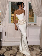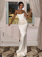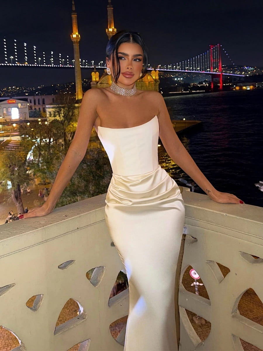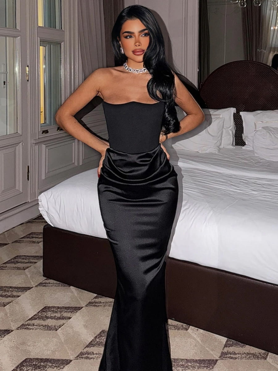 Satin Strapless Boned Corset Ruched Bodycon Mermaid Maxi Dress