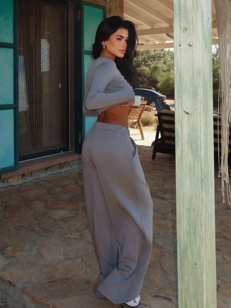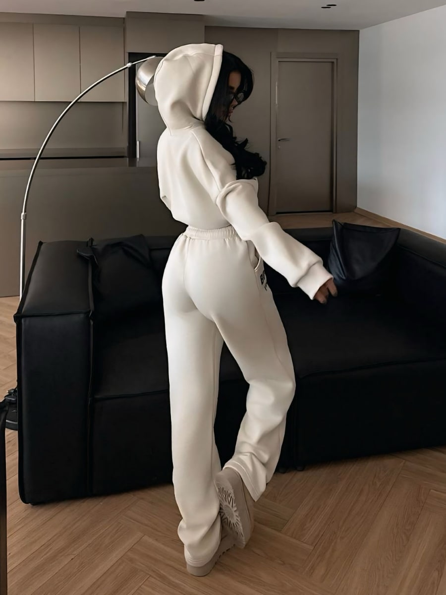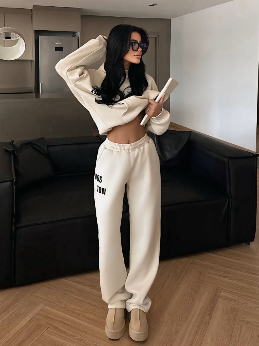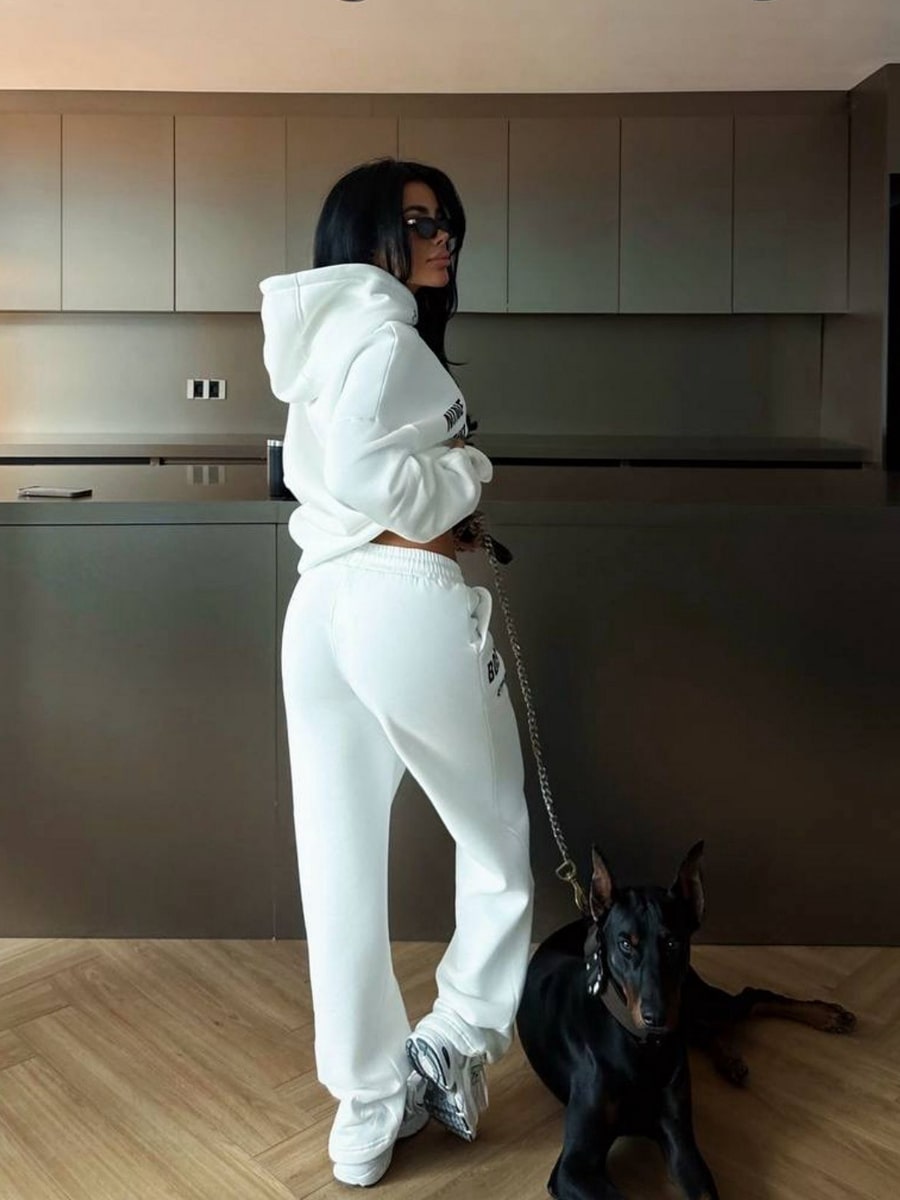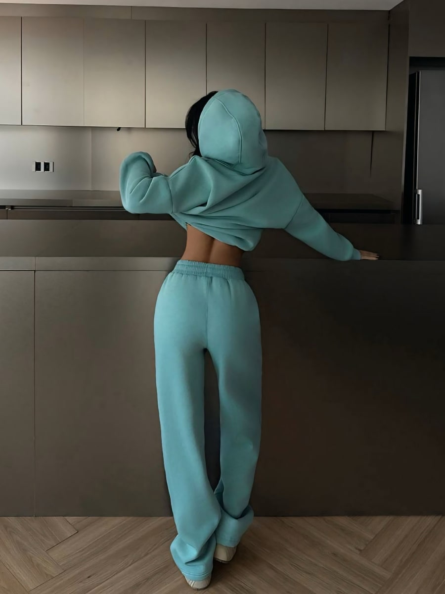2pcs Soft Fleece Cropped Hoodie & Wide-Leg Waistband Pants Set