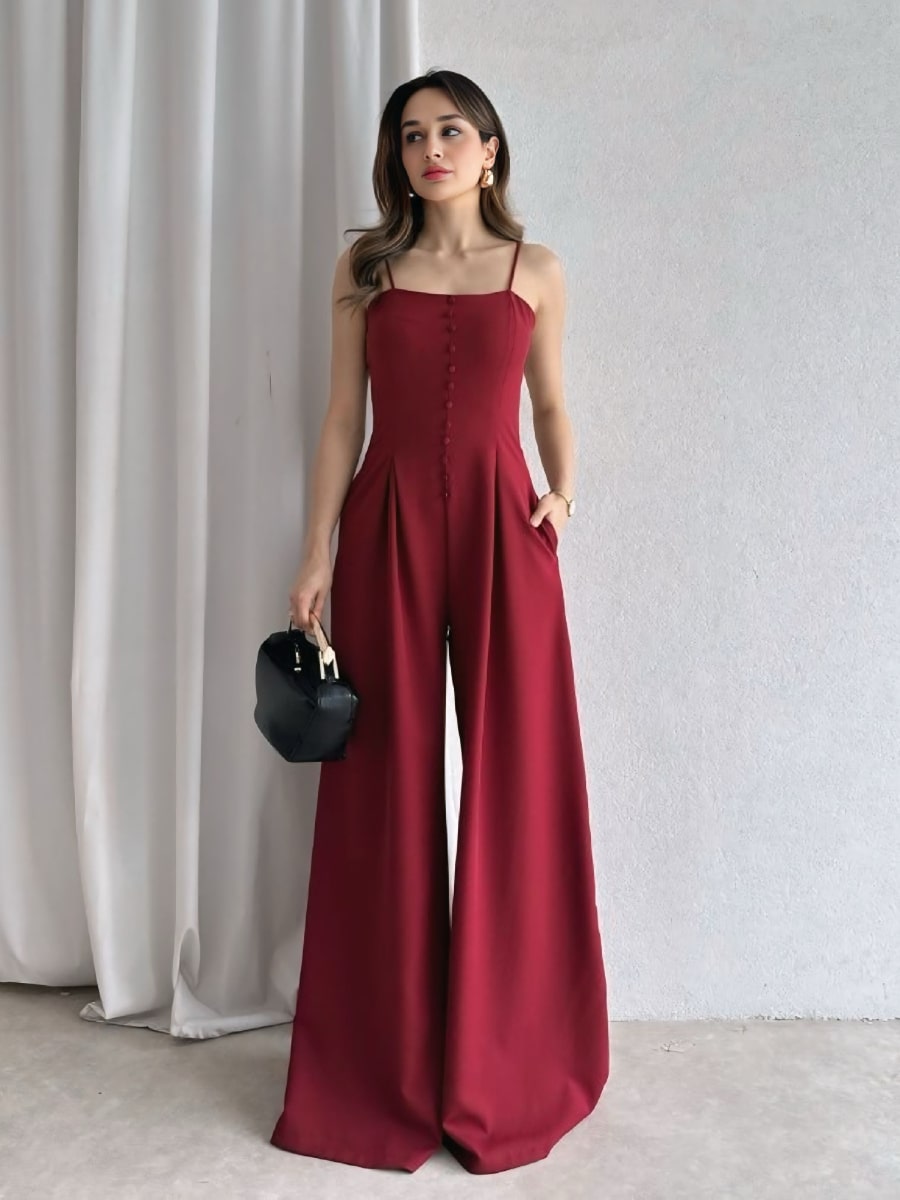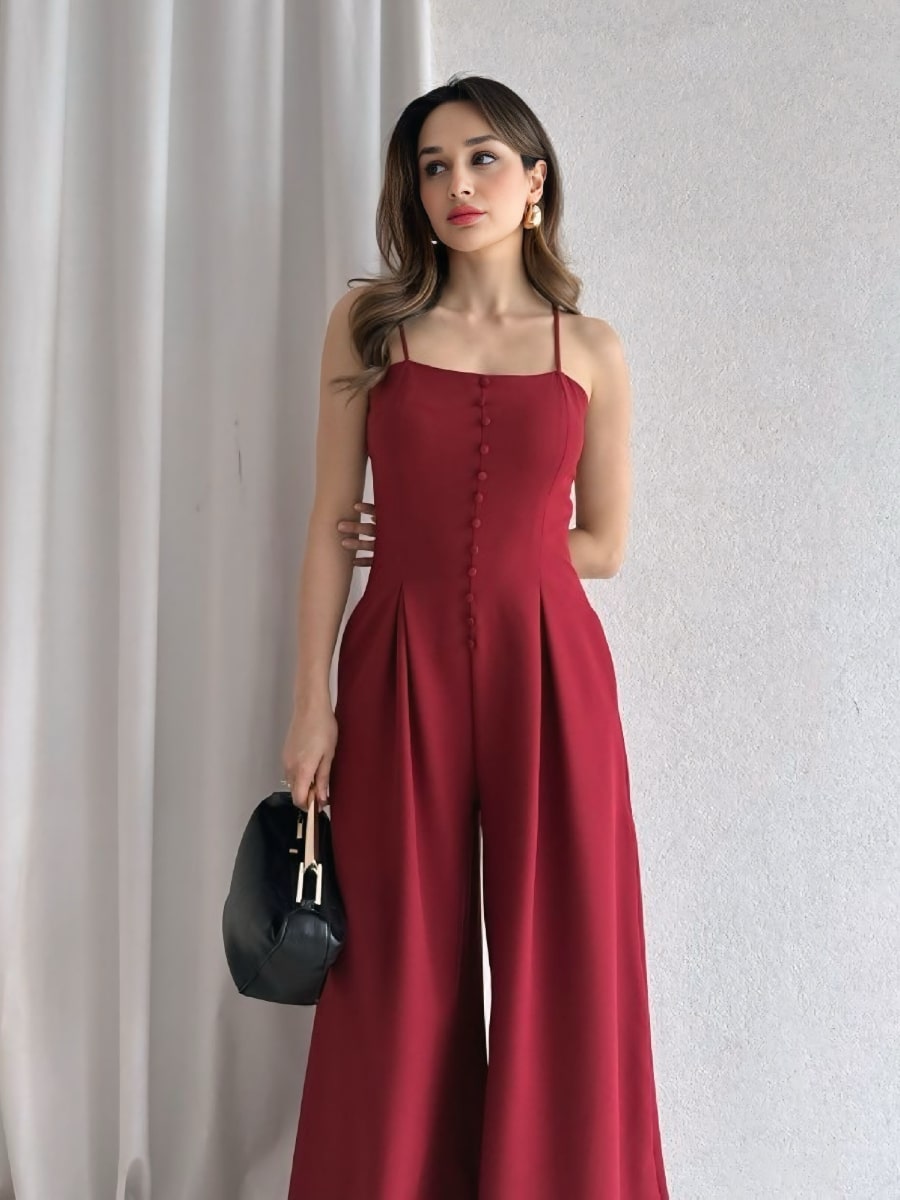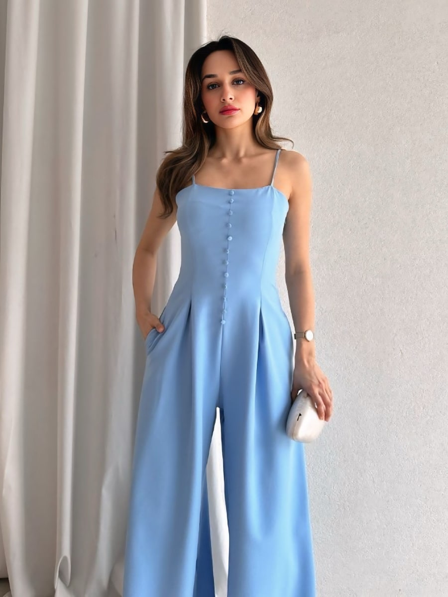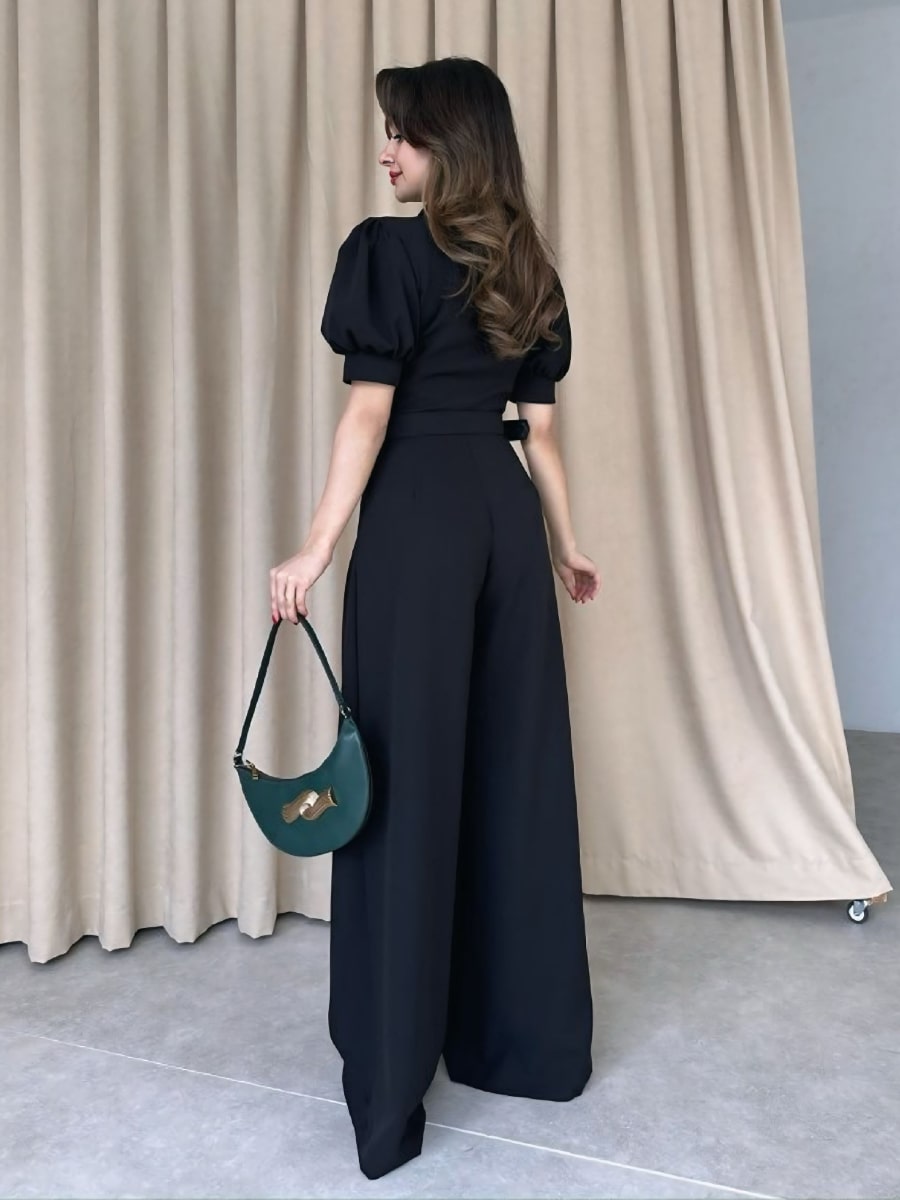 Turndown Collar Button Front Puff Sleeve Belted Jumpsuit