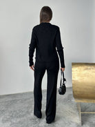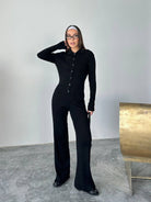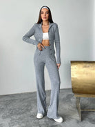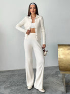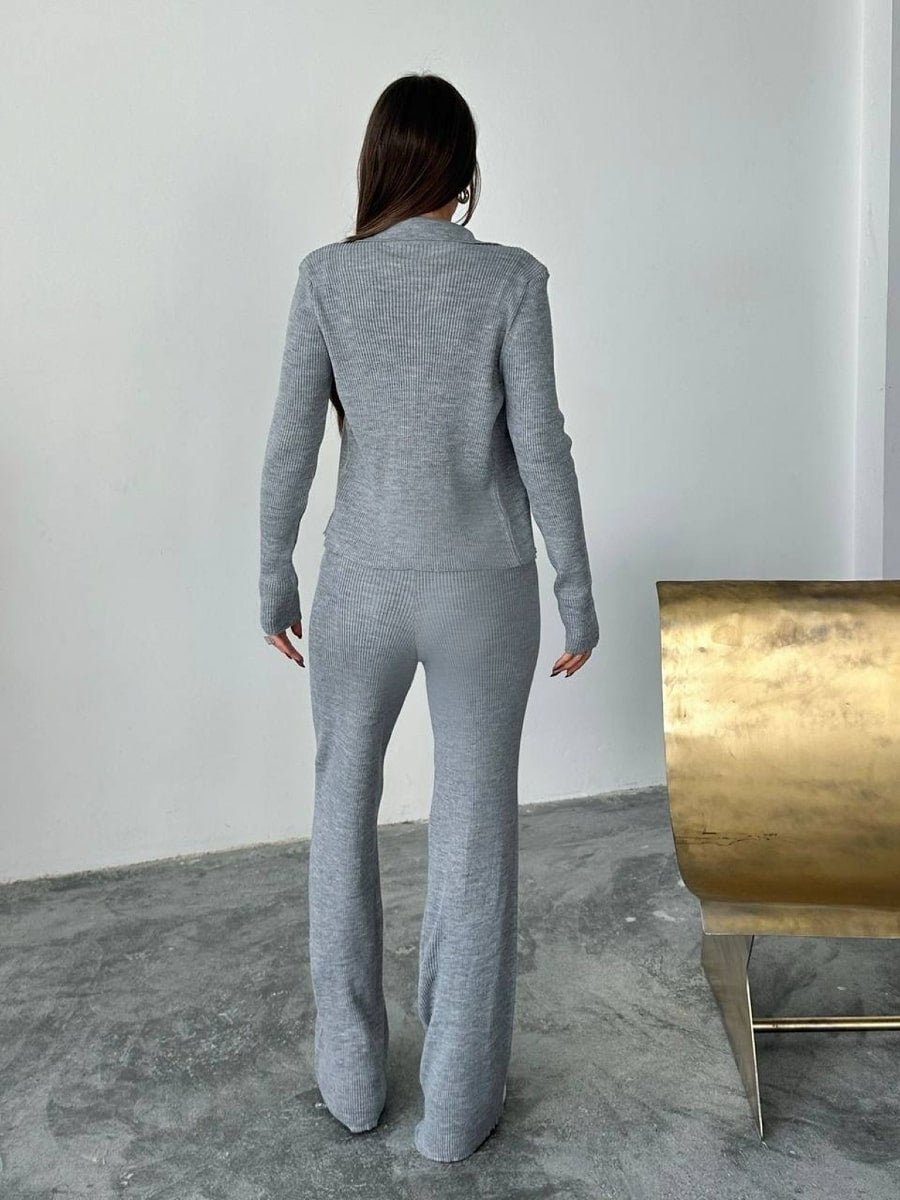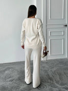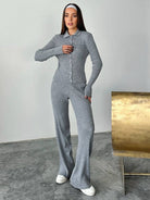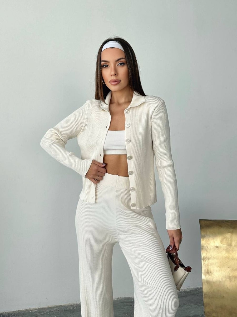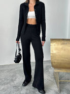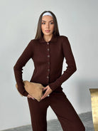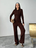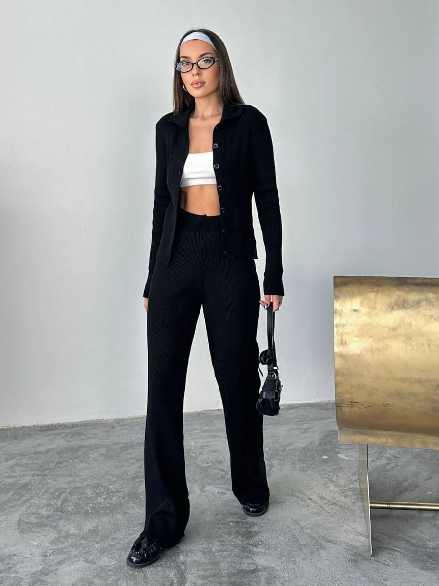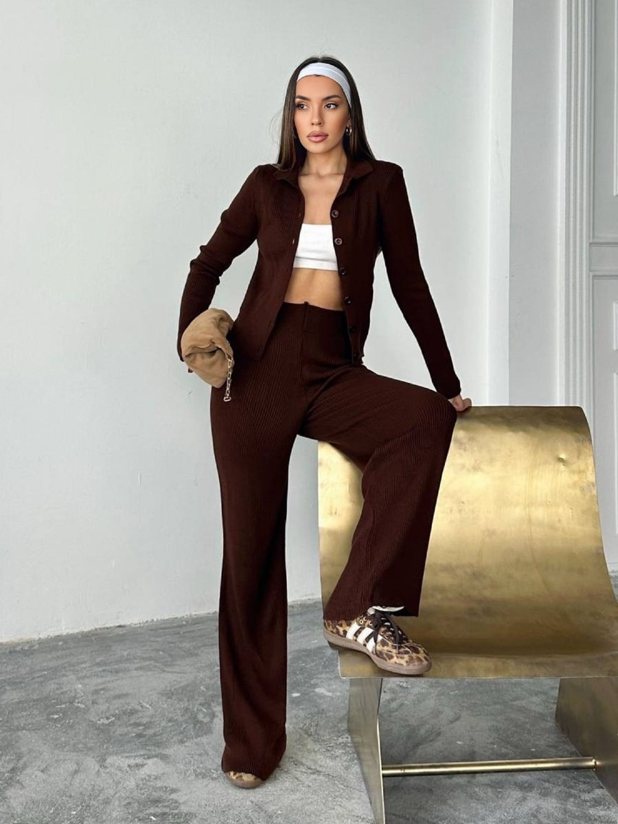 Ribbed Knit Two Piece Set Button Up Cardigan With High Waits Pants