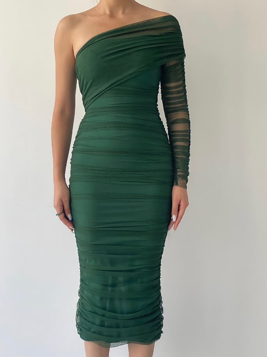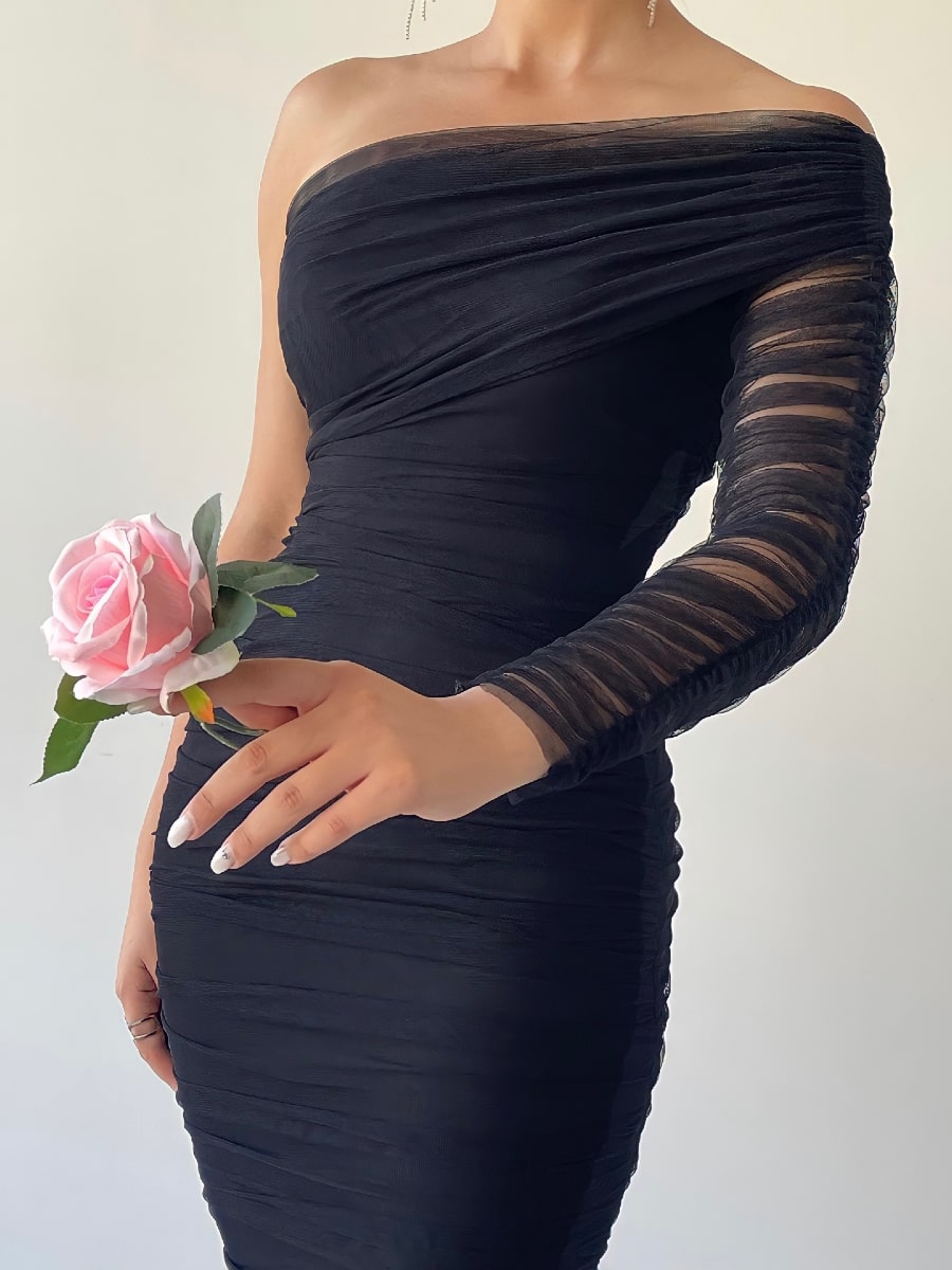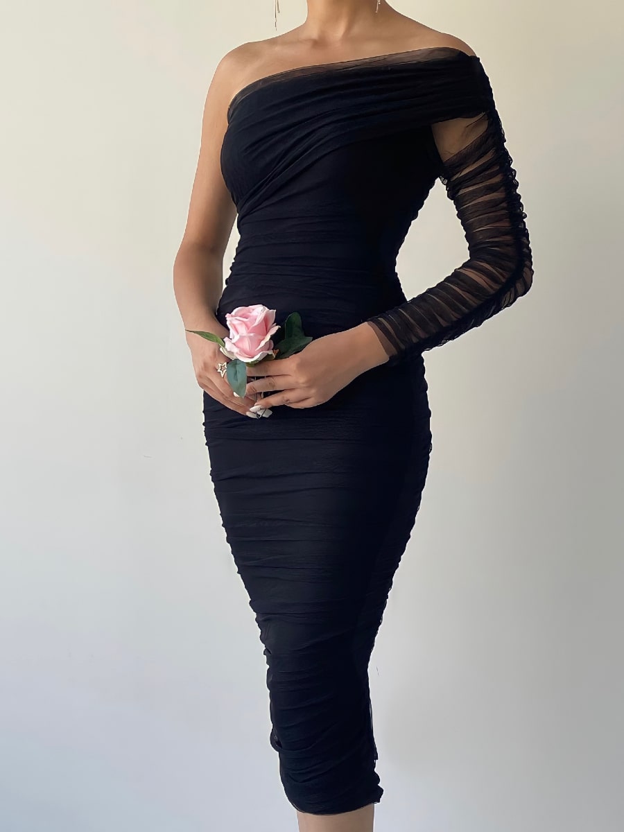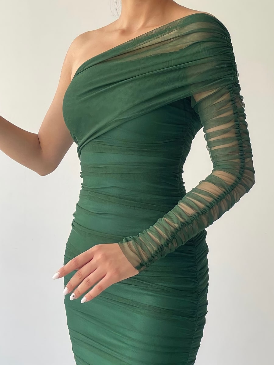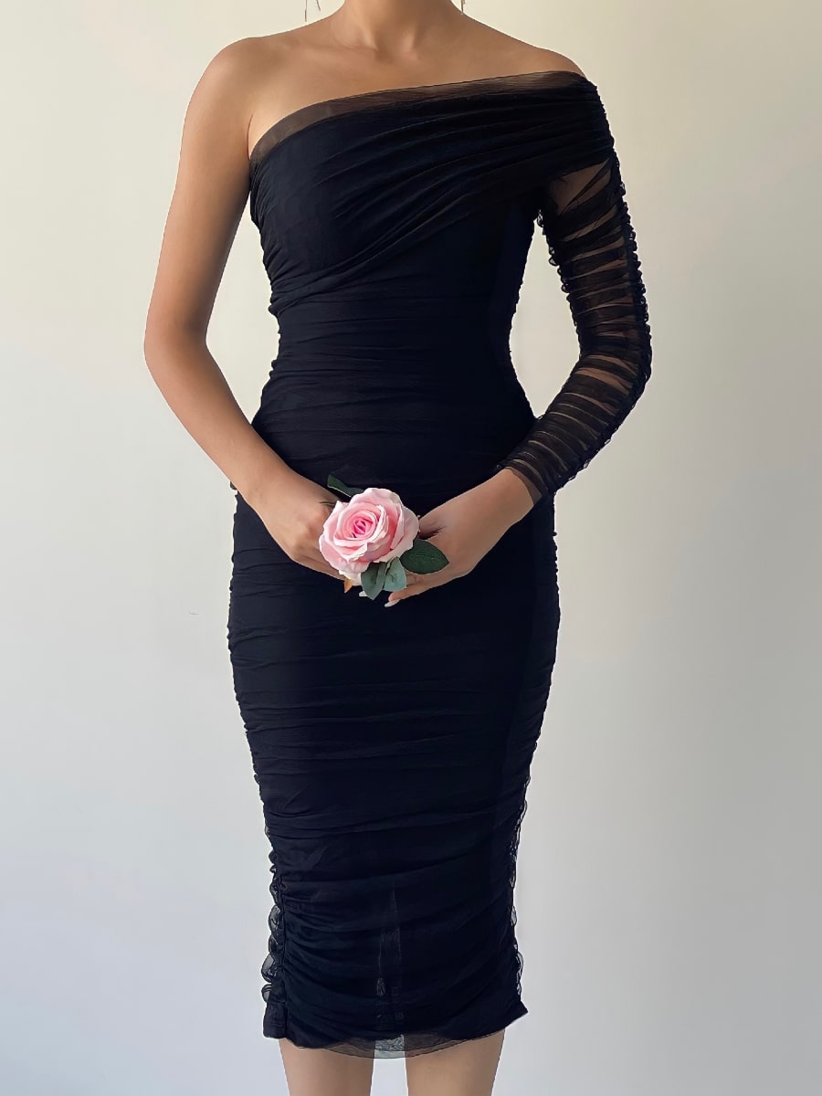 One Shoulder Ruched Mesh Dress
