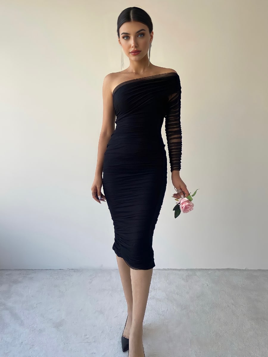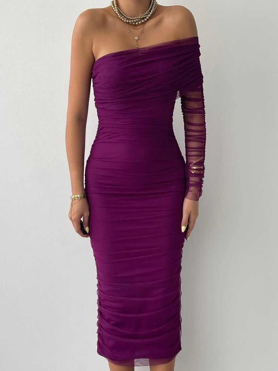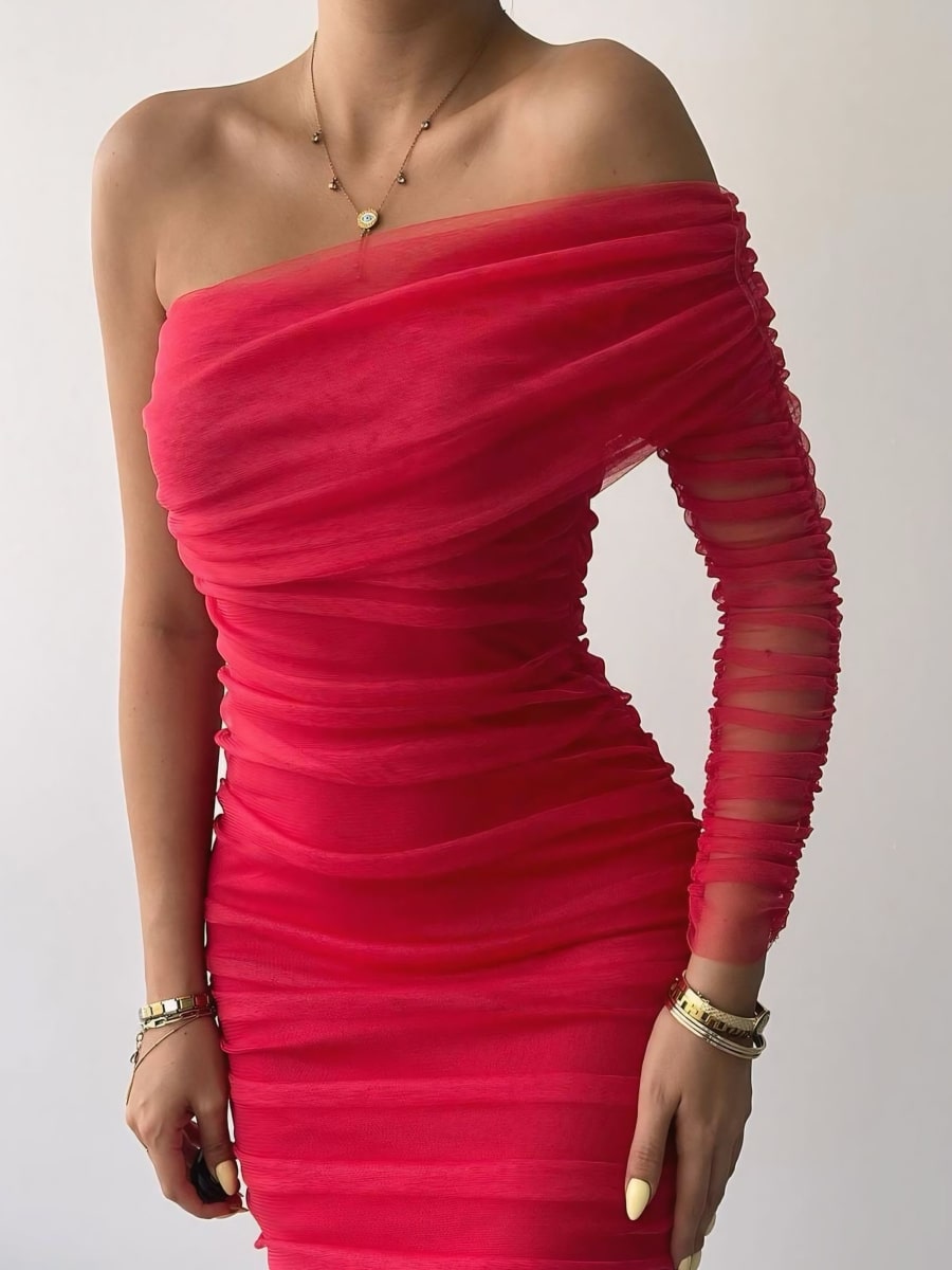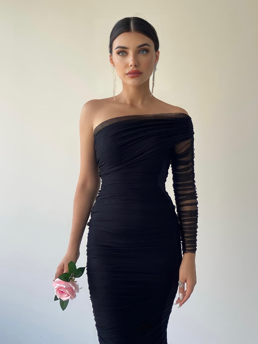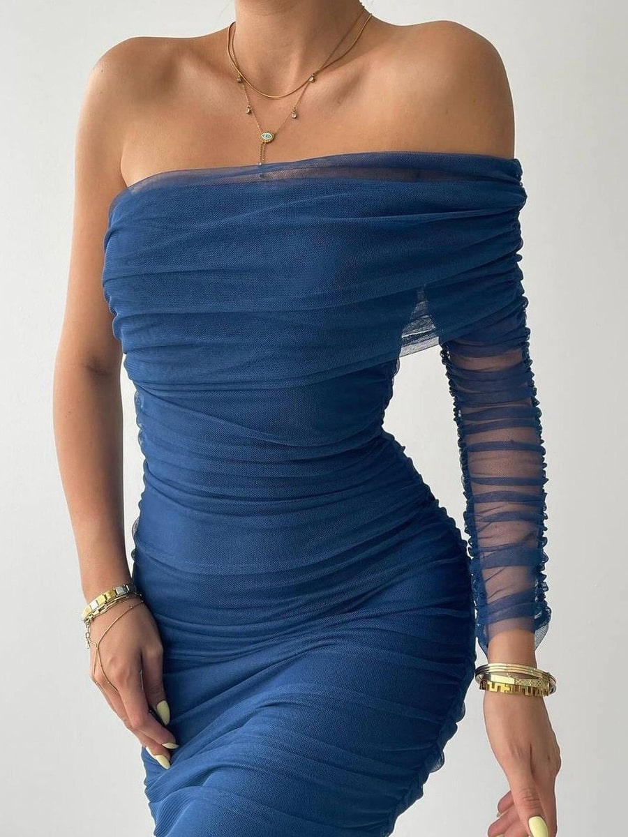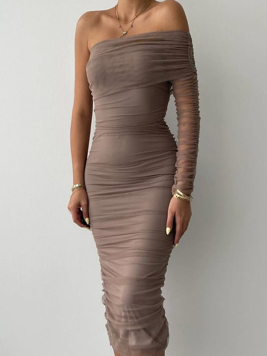 One Shoulder Ruched Mesh Dress