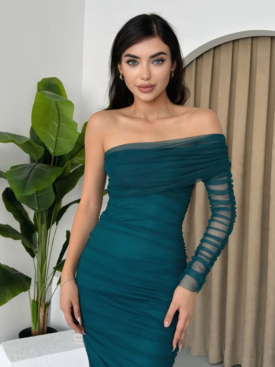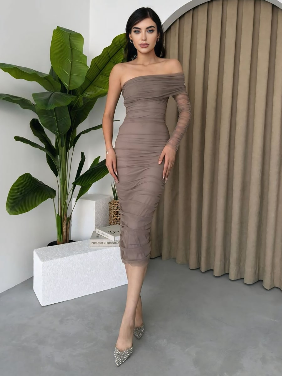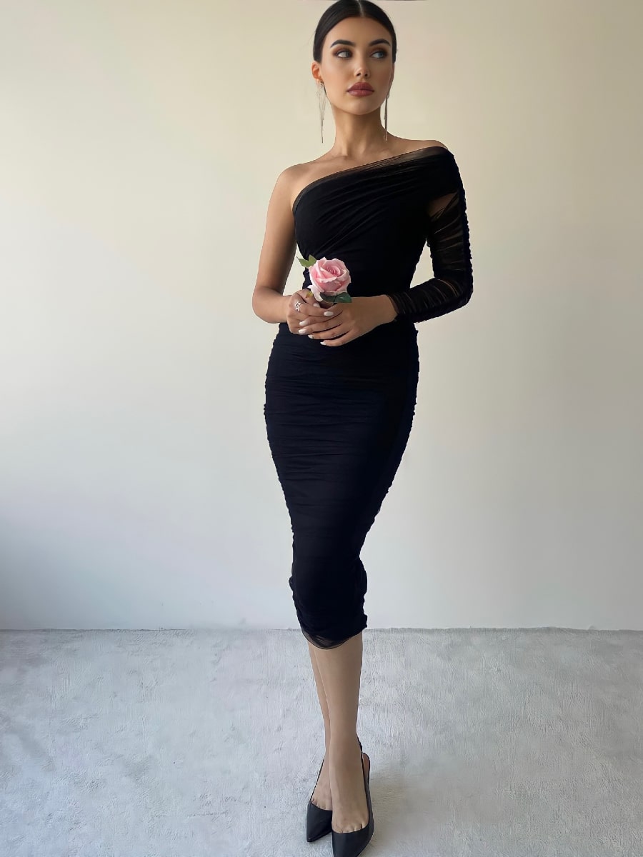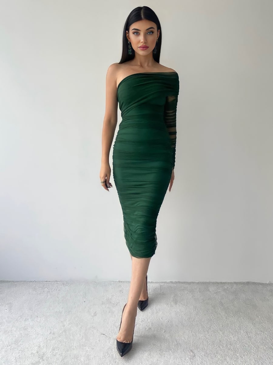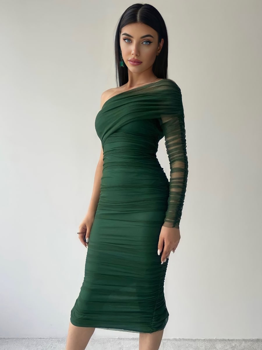 One Shoulder Ruched Mesh Dress